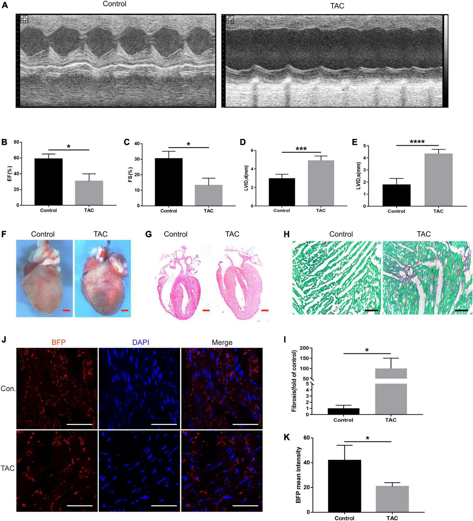 Figure 6. Expression of Cx43 in cardiomyocytes of heart failure. (A) Representative M-mode echocardiograms in the control and TAC groups; EF (B) and FS (C), LVIDd (D), and LVIDs (E) changes in TAC mice evaluated by echocardiography, *P < 0.05, ***P < 0.001, ****P < 0.0001; (F) whole-mount bright field images of the heart in two groups; (G) HE staining of heart sections of normal mice and TAC-operated mice. (H,I) Sirius red staining of the heart sections of normal mice and TAC-operated mice and its quantification analysis, fast green as background color, *P < 0.05; (J) expression of BFP (red) in the myocardium of Cx43-BFP-GFP mice with heart failure. Red scale bar = 1 mm, black scale bar = 200 μm, white scale bar = 100 μm; (K) fading of BFP fluorescent intensity was observed in TAC mice, *P < 0.05.