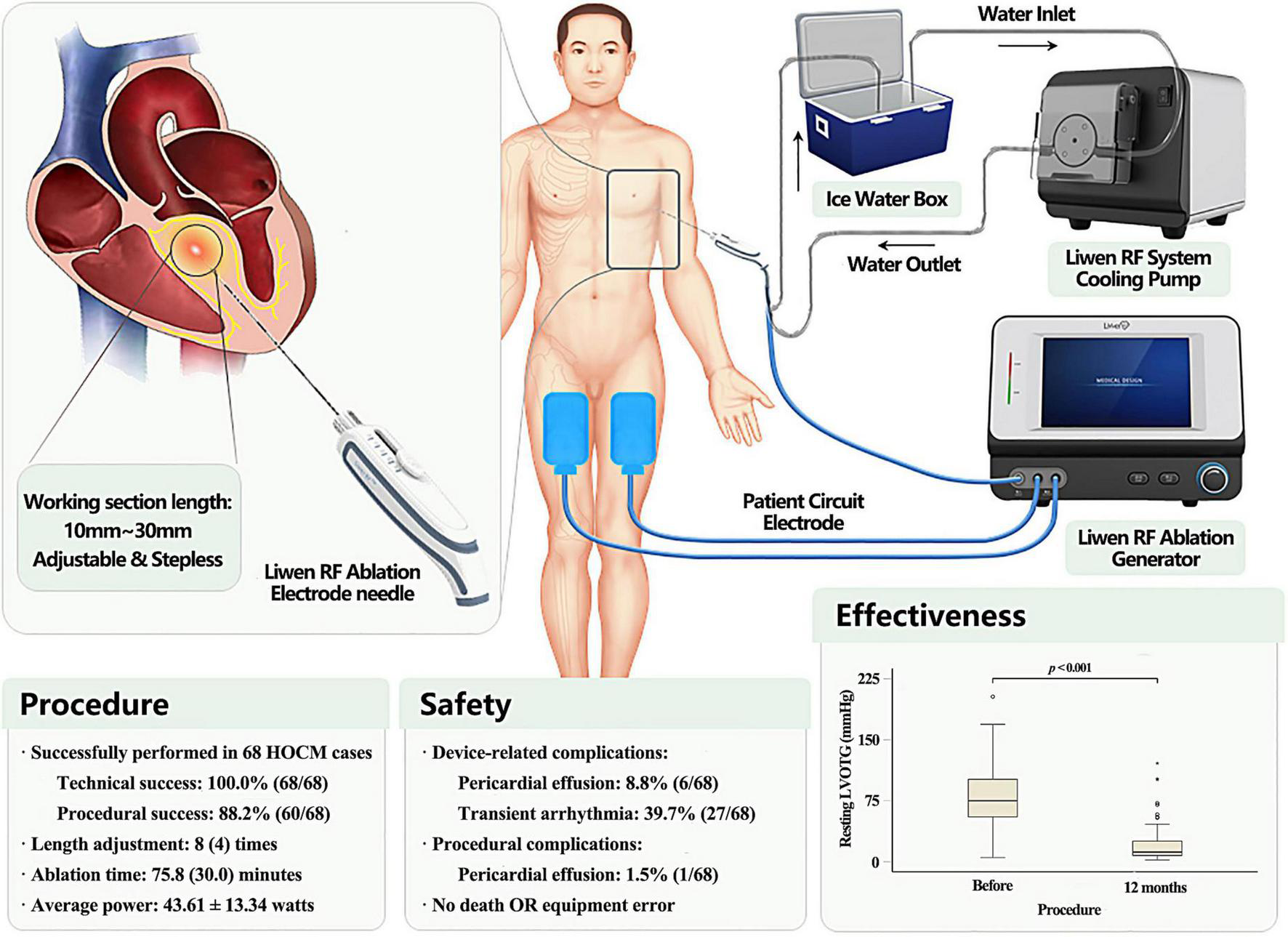 Description of Liwen RF™ ablation system and main findings. Liwen RF™ (Hangzhou Nuo Cheng Medical Instrument Co., Ltd., Hangzhou, Zhejiang, China) is a novel radiofrequency ablation system with a stepless adjustable length needle electrodes for percutaneous intramyocardial septal radiofrequency ablation (PIMSRA). The device is an integrated system, comprising ablation electrode kit, ablation generator, cooling system, and patient circuit.