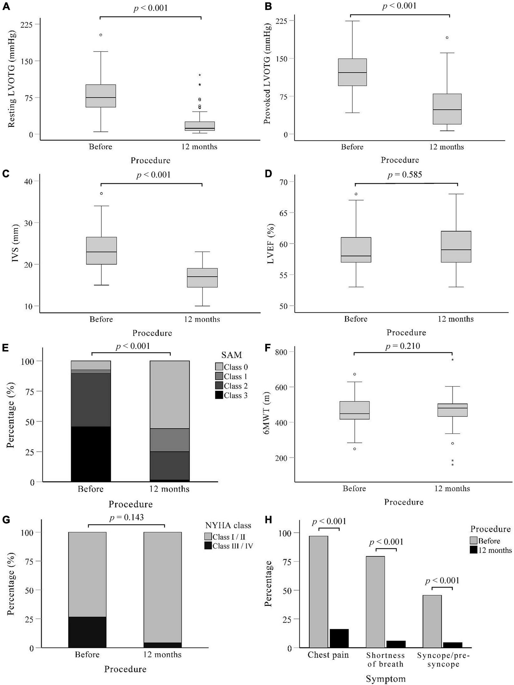 All procedures were technically successful. The total energy output time of the system was 75.8 (IQR: 30.0) min, and the average power was 43.61 ± 13.34 watts. No ablation system error occurred. The incidence of pericardial effusion or hemorrhage, transient arrhythmia and resuscitation was 8.8, 39.7, and 1.5% during procedure, respectively. None of the patients died. During 30-day follow-up, there were no complications with the exception of a pericardial effusion in one patient (1.5%). No further complications were reported after 30 days. The patients’ resting [baseline: 75 (IQR: 48) vs. 12-months: 12 (IQR: 19) mmHg, p < 0.001] and provoked [baseline: 122 (IQR: 53) vs. 12-months: 41 (IQR: 59) mmHg, p < 0.001] LVOT gradients decreased significantly during follow-up.