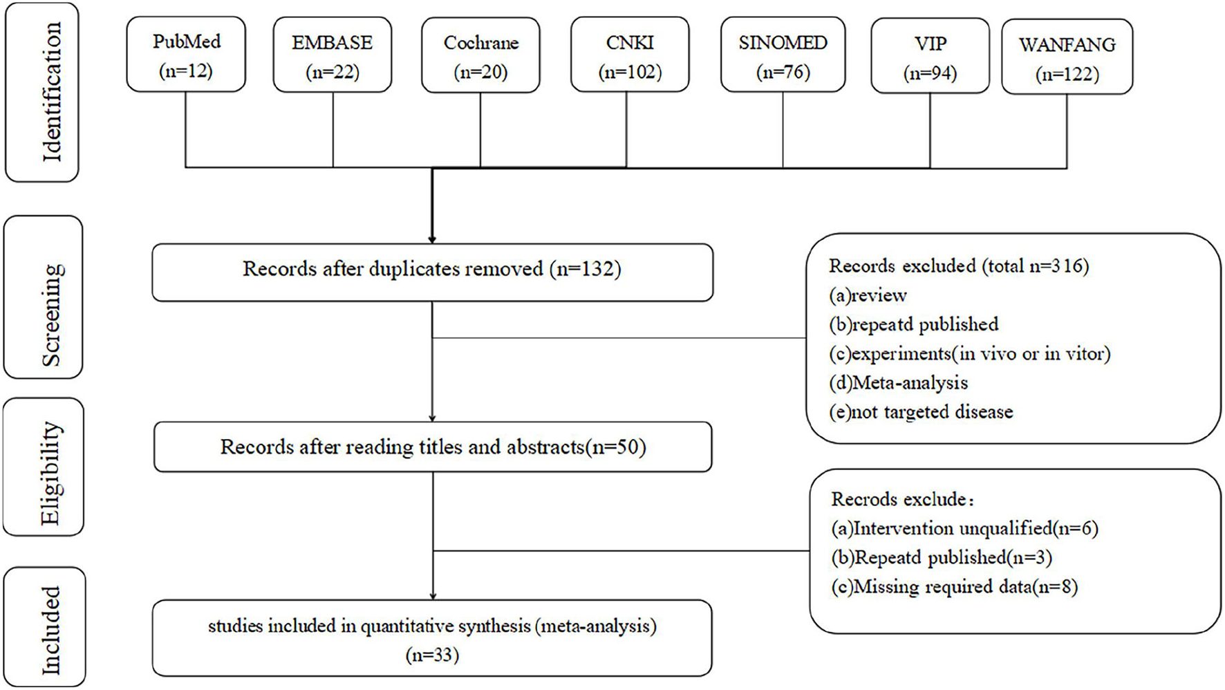 First, the database search identified 448 articles for evaluation (Wanfang: 120 articles; CNKI: 102 articles; VIP: 93 articles; SINOMED: 76 articles; Embase: 22 articles; Cochrane Library: 20 articles; and PubMed: 12 articles). Subsequently, 316 duplicate records were identified and removed. After screening titles and abstracts, 82 articles met the exclusion criteria. Finally, 33 articles (7–10, 15–43) were included in the meta-analysis (Figure 1).