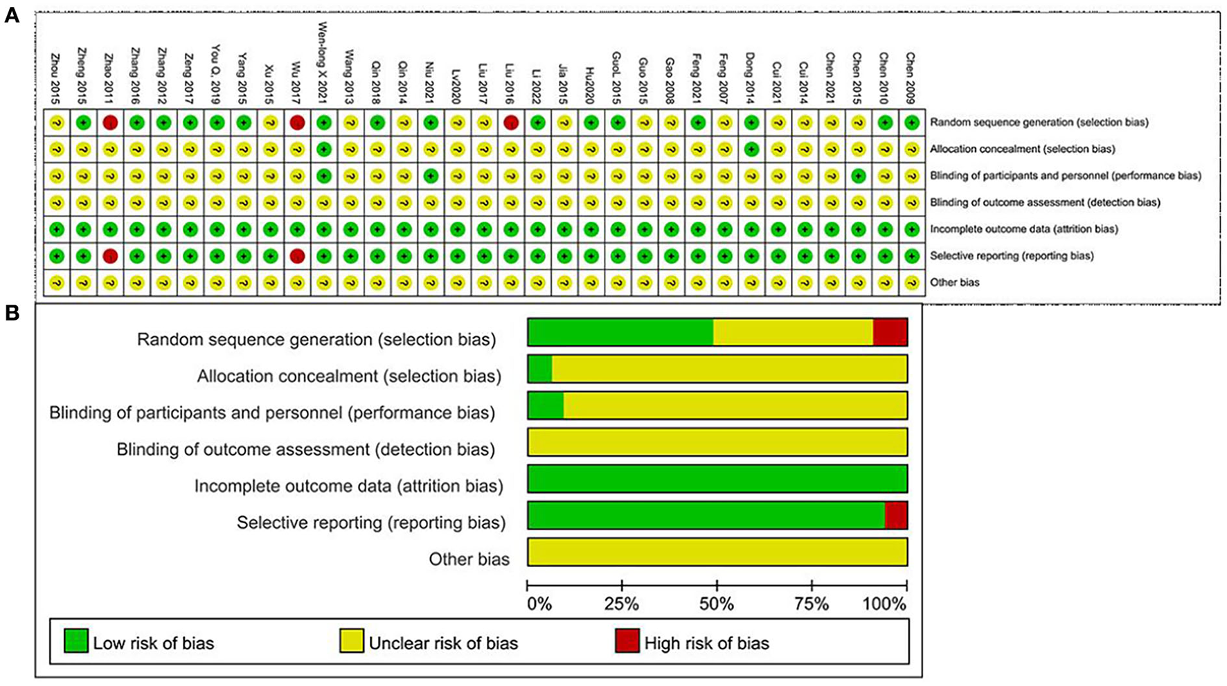 The Cochrane Handbook tool was used for assessing the risks of bias in this study. In all the studies, subjects were randomly assigned. A total of 15 studies that provided the detailed information about that random assignment method had a low risk of bias; two studies that randomized subjects according to the time of admission and treatment protocol had a high risk of bias; eight studies that did not report information about the randomization method had an unclear risk of bias. Regarding allocation concealment, two studies that provided descriptions of allocation methods had a low risk of bias. The remaining 29 studies that did not describe the allocation process had an unclear risk of bias. Regarding blinding methods, two studies that blinded the patients but not the investigators had a low risk of bias. The remaining studies that did not report patient or investigator blinding had an unclear risk of bias. In addition, two studies that did not report the results of the pre-specified indicators had a high risk of bias due to selective outcome reporting. The remaining 31 studies that included complete data results had a low risk of bias. All included studies stated that the baseline characteristics of the two groups were not significantly different (Figure 2).