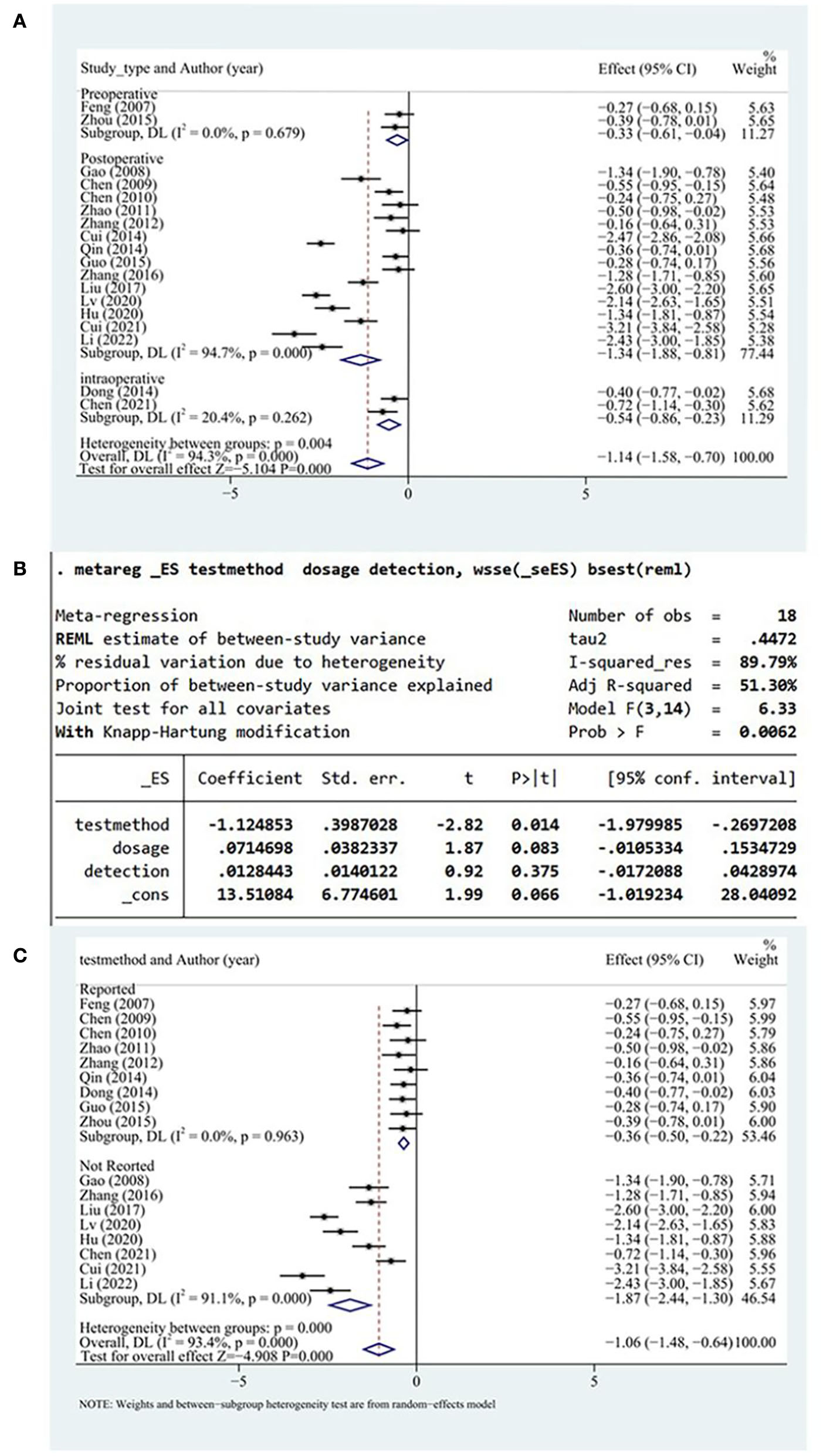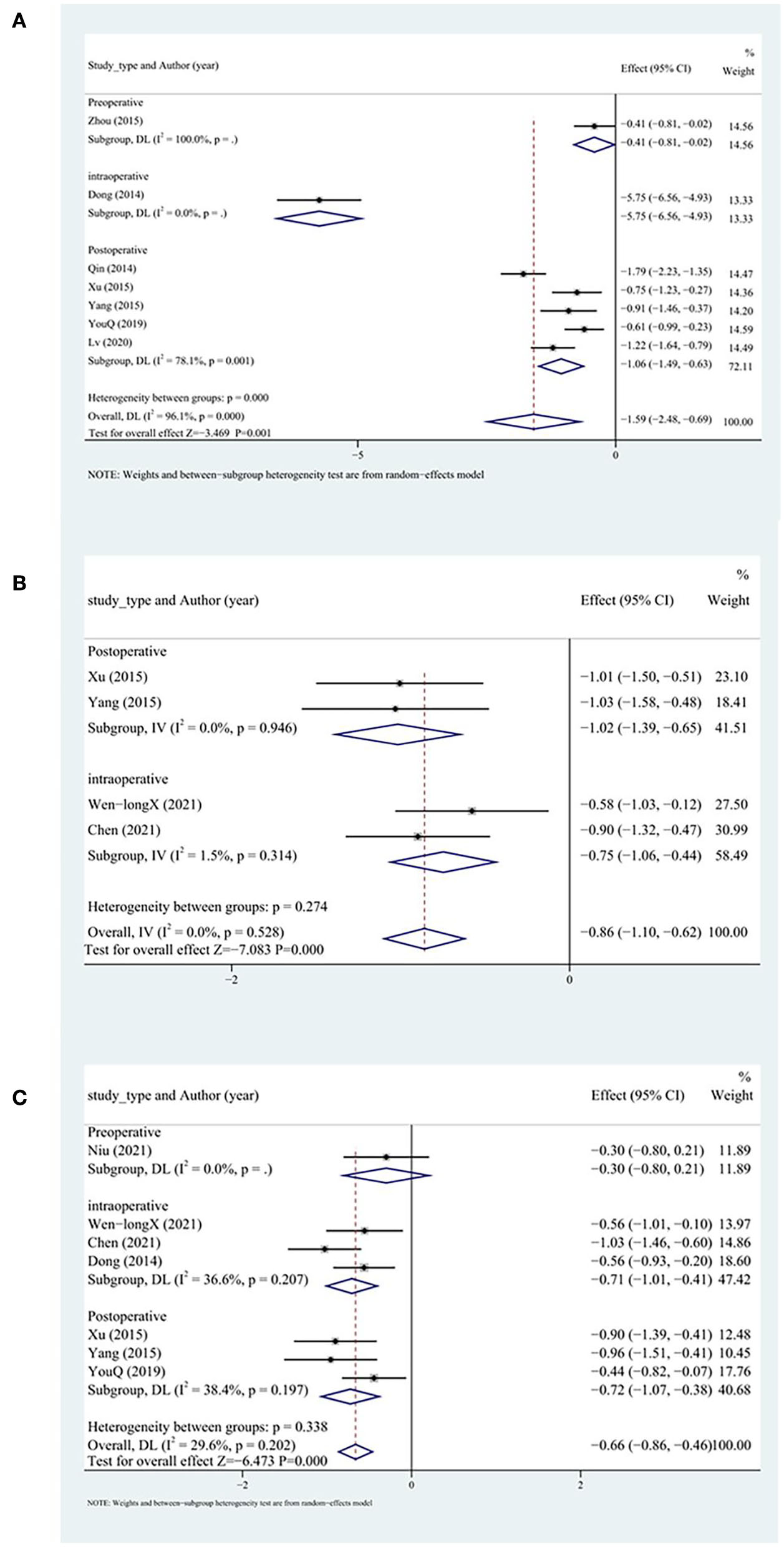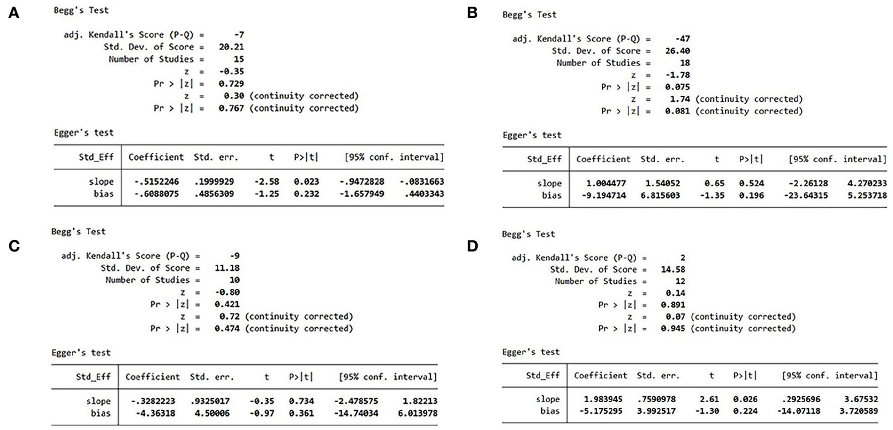 STATA 17.0 was used for the meta-analysis (13). Data are presented as risk ratios (RRs) and standardized mean differences (SMDs) with 95% confidence intervals (CIs). Potential heterogeneity was assessed using Cochran Q and I2 statistical tests. A fixed-effects model was used to compare data from studies with low heterogeneity (14), whereas a random-effects model was used to compare data from studies with high heterogeneity (P < 0.05, I2 > 50%). Subgroup, sensitivity, and meta-regression analyses were used to examine heterogeneity between the outcomes. The potential of a publication bias was assessed using Egger's and Begg's tests.