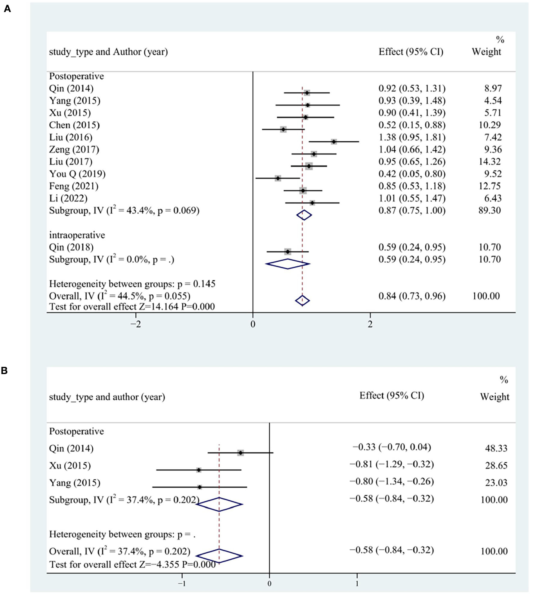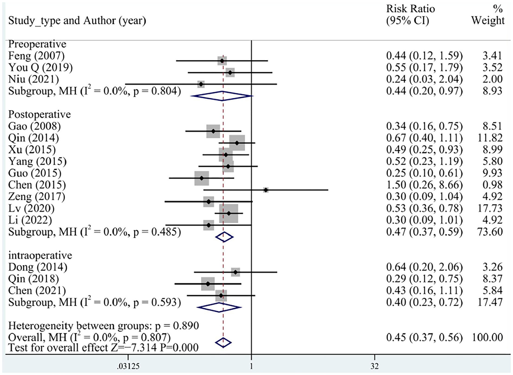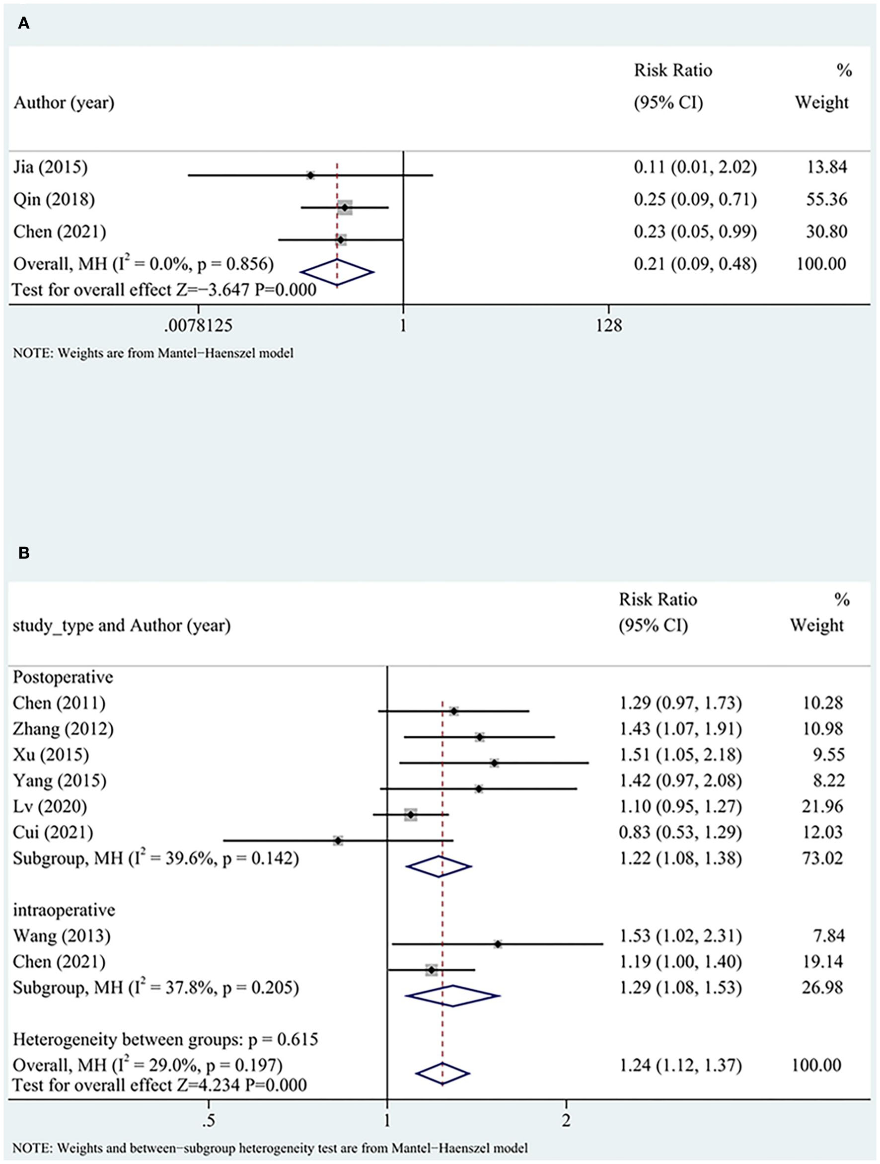 STATA 17.0 was used for the meta-analysis (13). Data are presented as risk ratios (RRs) and standardized mean differences (SMDs) with 95% confidence intervals (CIs). Potential heterogeneity was assessed using Cochran Q and I2 statistical tests. A fixed-effects model was used to compare data from studies with low heterogeneity (14), whereas a random-effects model was used to compare data from studies with high heterogeneity (P < 0.05, I2 > 50%). Subgroup, sensitivity, and meta-regression analyses were used to examine heterogeneity between the outcomes. The potential of a publication bias was assessed using Egger's and Begg's tests.
