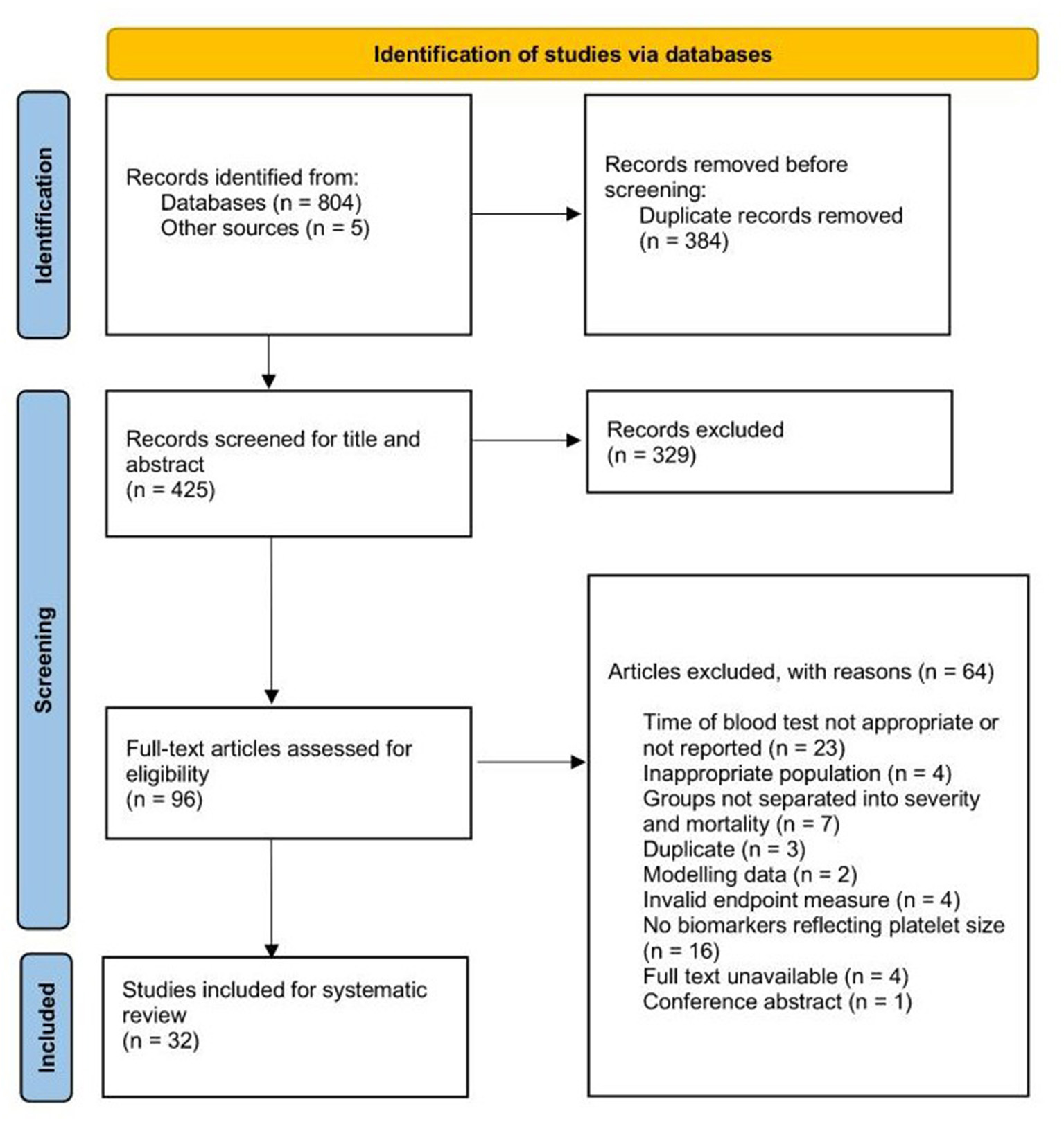 We identified a total of 236 records from the OVID (Medline, Embase, and CENTRAL) search, 132 records from the Web of Science database, 133 records from PubMed, 196 records from the MedRxiv database, 107 from CNKI and five records from references searches. Of these, 329 were duplicates. Four-hundred and twenty-five records were title and abstract screened, and 96 were taken to full-text review. Sixty-four studies were excluded at the full-text review stage and 32 studies were included in the systematic review (Figure 1).