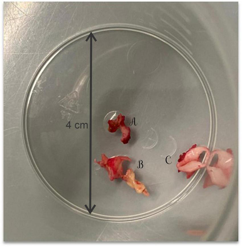 The calcified mass extracted intraoperatively from the left subclavian artery (A), the aortic arch (B), and the left common carotid artery (C).