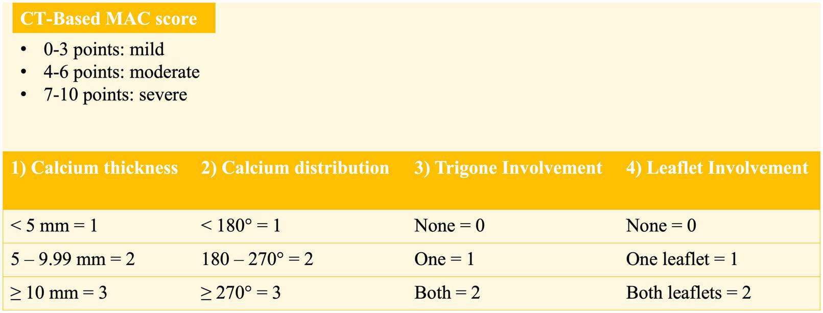 Guerrero et al. (9), through a retrospective analysis of 87 baseline cardiac CT scan of Valve-in-MAC candidates, proposed a scoring system of MAC severity.