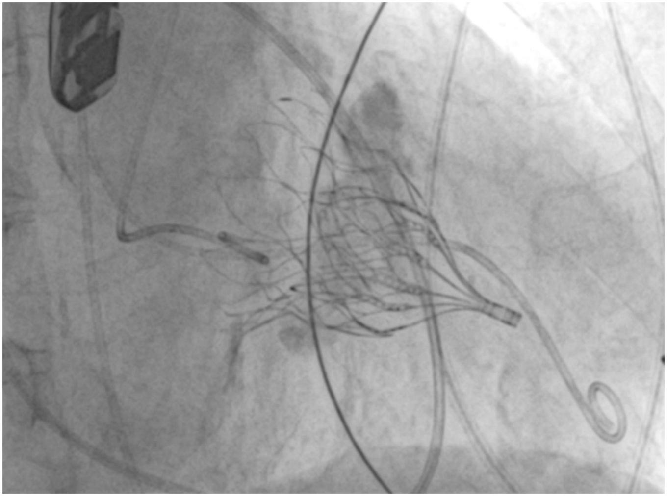 Fluoroscopy image showing a successful Tendyne implantation in severe mitral annular calcification (MAC).