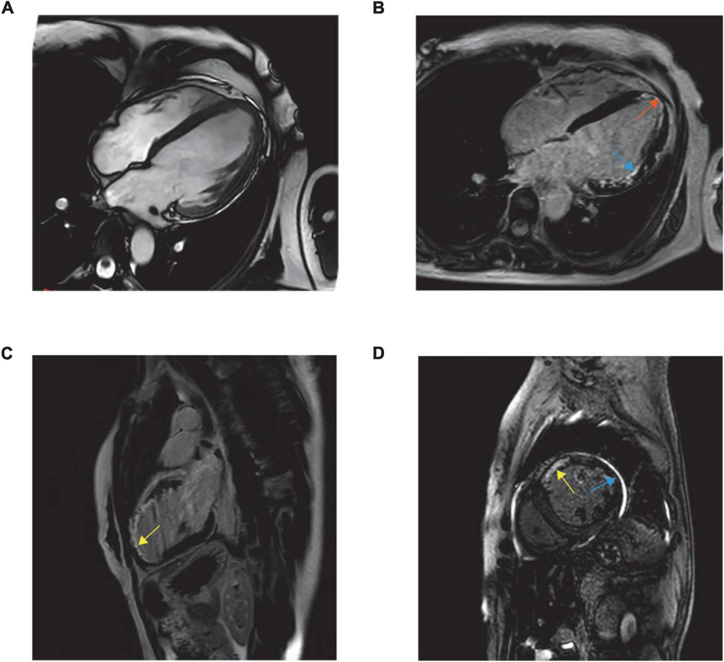 The poor clinical response promoted further imaging (Figure 1). Cardiac magnetic resonance imaging (MRI) indicated LV dilation (66 mm), thinning of the left ventricle region wall (3 mm) and abnormal motion and suggested transmural infarction at the apex (orange arrow) and the lateral wall (blue arrow) and partial infarction at the anterior wall (yellow arrow).