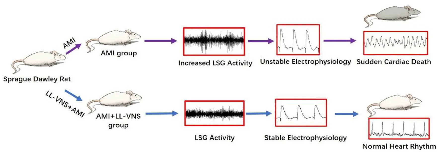 Acute myocardial infarction (AMI) is one of the most severe cardiac diseases, with high morbidity and mortality rates (1). Ventricular arrhythmias (VAs) function as a marker of enhanced risk of sudden cardiac death in AMI. Early rapid reperfusion following coronary artery occlusion remains the most effective strategy to rescue ischemic myocardium and improve long-term clinical outcomes (2). However, reperfusion can also induce sustained ventricular tachycardia, leading to ventricular fibrillation (3). Thus, there is a strong need for a strategy that can effectively decrease the incidence of ventricular arrhythmias caused by ischemia. It is already well-known that autonomic imbalance contributes to the pathogenesis of myocardial ischemia (4). Recently, non-pharmacological neuromodulations have been applied for the prevention of VAs (5). Our previous study has demonstrated that low-level vagus nerve stimulation (LL-VNS) can effectively reduce episodes of ventricular arrhythmia (6). However, the potential mechanisms by which it influences the electrophysiological properties of the ventricles remain unknown.