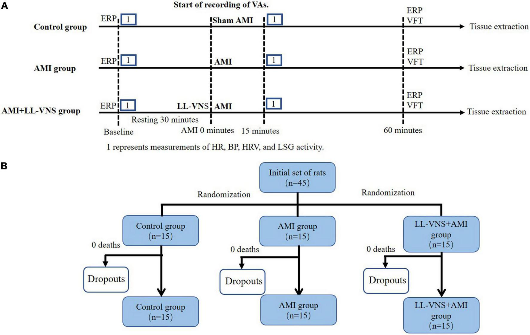 The experimental protocol (A) and allocation to groups (B). AMI, acute myocardial infarction; BP, blood pressure; ERP, effective refractory period; HR, heart rate; HRV, heart rate variability; LL-VNS, low-level vagus nerve stimulation; LSG, left stellate ganglion.