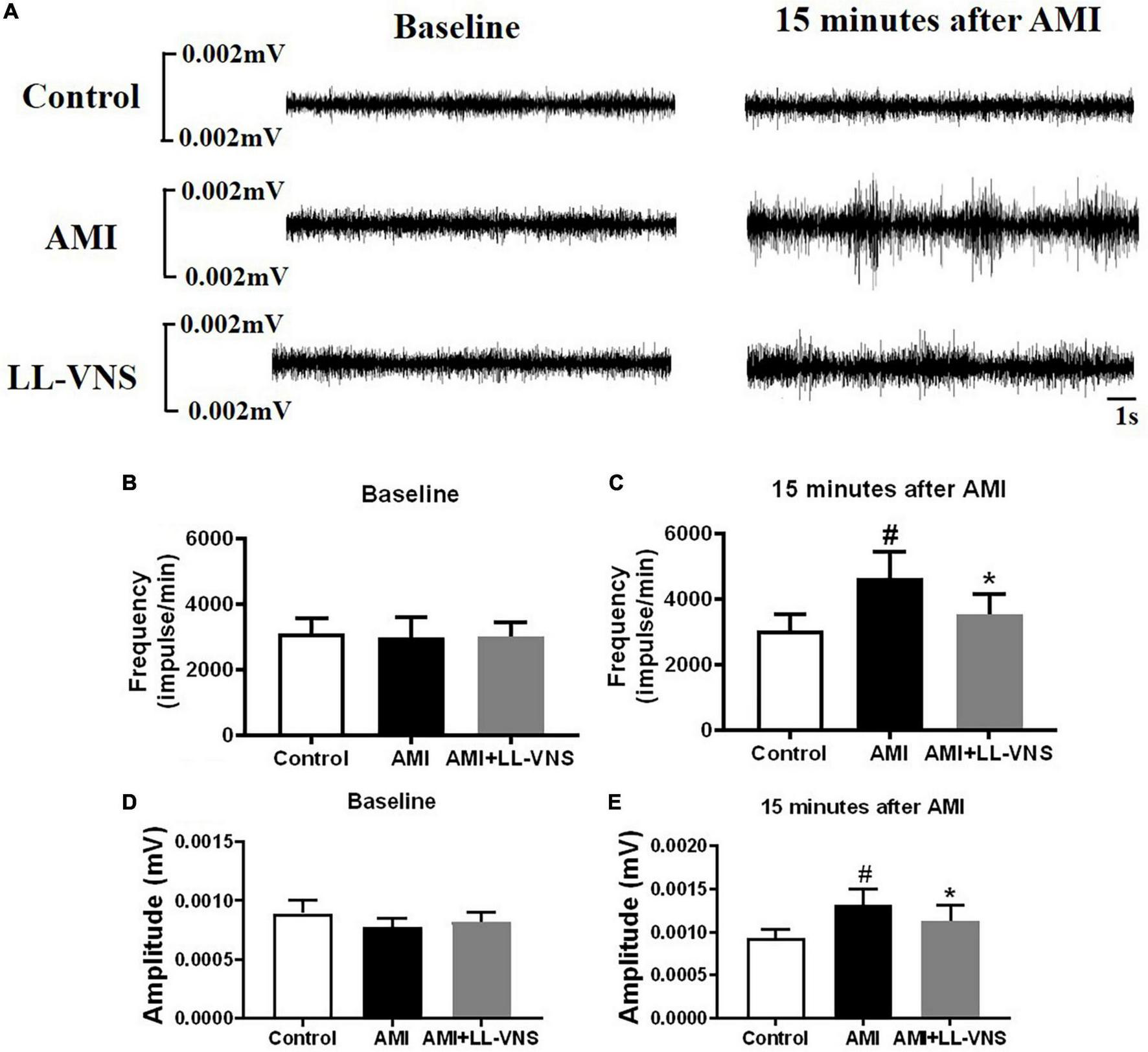 Forty-five rats were divided into three groups: a Control group (sham AMI followed by sham LL-VNS, n = 15), an AMI group (AMI followed by sham LL-VSN for 60 mins, n = 15), and an AMI + LL-VNS group (AMI followed by LL-VSN for 60 mins, n = 15). Heart rate variability (HRV), ventricular effective refractory period (ERP), ventricular fibrillation threshold (VFT), and left stellate ganglion (LSG) activity were measured at baseline and during AMI. Finally, myocardial tissues were collected for tissue analysis.
