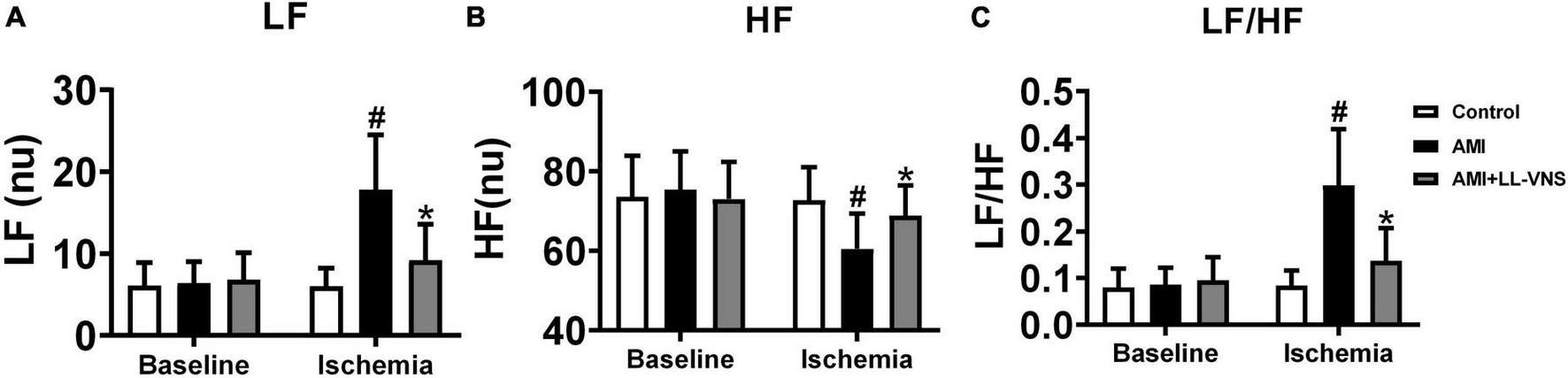 Effects of LL-VNS on cardiac autonomic nervous activity. Panels illustrate changes among the three groups between baseline and measurements taken 30 min after AMI in LF (A), HF (B), and LF/HF (C). AMI induced an increase in LF and LF/HF, but a reduction in HF, as indicated by comparison between the AMI and Control groups. In comparison with the AMI group, LF and LF/HF were significantly reduced in the LL-VNS group, but HF was increased. AMI, acute myocardial infarction; HF, high frequency; LF, low frequency; LF/HF, low frequency to high frequency ratio; LL-VNS, low-level vagus nerve stimulation. n = 15 per group. #P < 0.05 in a comparison with the Control group. *P < 0.05 in a comparison with the AMI group.