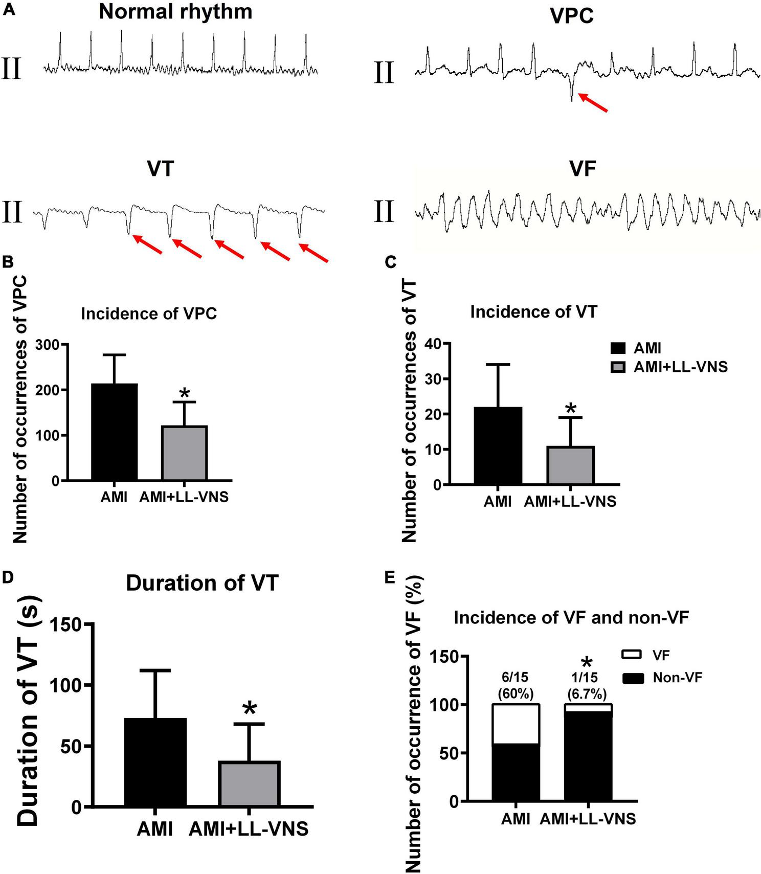 The occurrence of ventricular arrhythmias after complete occlusion of the left anterior descending branch. (A) ECG traces representing typical examples of VAs, including VPC, VT, and VF. (B) Comparison of the incidence of VPC throughout the entire 60 min between the AMI group and the AMI + LL-VNS group. (C) LL-VNS decreased the incidence of VT within 60 min after AMI. (D) LL-VNS shortened the duration of episodes of VT occurring within 60 min after AMI. (E) LL-VNS reduced the incidence of spontaneous VF. AMI, acute myocardial infarction; ECG, electrocardiogram; LL-VNS, low-level vagus nerve stimulation; VF, ventricular fibrillation; VPC, ventricular premature contraction. n = 15 per group. *P < 0.05 in a comparison with the AMI group.