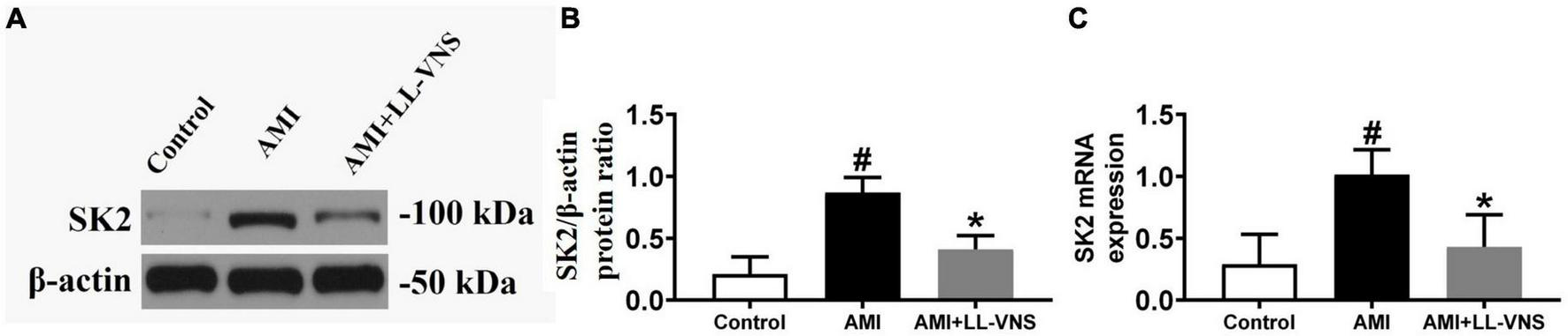 Figure 6A shows a representative immunoblot prepared with anti-SK2 antibody. As illustrated in Figure 6B, AMI significantly increased SK2 protein expression in comparison with the Control group. LL-VNS significantly reduced the expression of ventricular SK2 in the ischemic area in comparison with the AMI group (P < 0.05). Figure 6C shows the effects of LL-VNS on ventricular SK2 mRNA expression. AMI increased SK2 expression in comparison with the Control group, while LL-VNS mitigated the AMI-induced increase in ventricular SK2 mRNA expression in the ischemic area in comparison with the AMI group.