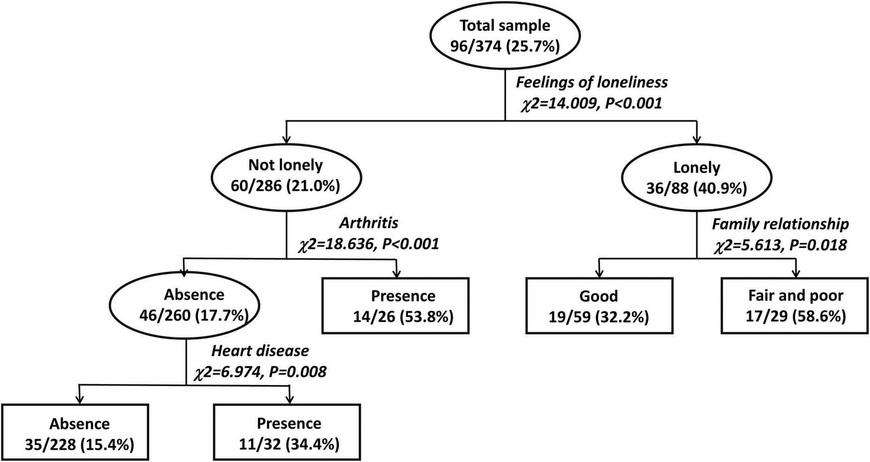 As shown in Figure 1, the CTA model had three layers of eight nodes, including five end nodes. Four major correlates of depressive disorders were identified: loneliness was the most salient, followed by arthritis, family relationship, and heart disease. Compared to respondents who were not lonely, lonely respondents were 1.9-fold more likely to have depressive disorders (40.9 vs. 21.0%, P < 0.001). Among the lonely respondents, relative to those who had good family relationship, those having fair and poor relationship were 1.8-fold more likely to have depressive disorders (58.6 vs. 32.2%, P = 0.018). Among respondents who were not lonely, relative to those having no arthritis, those having arthritis were 3.0-fold more likely to have depressive disorders (53.8 vs. 17.7%, P < 0.001). Among respondents who were not lonely and did not suffer from arthritis, relative to those having no heart disease, those having heart disease were 2.2-fold more likely to have depressive disorders (34.4 vs. 15.4%, P = 0.008). There were statistically significant interactions between loneliness and arthritis, loneliness and family relationship, and arthritis and heart disease.