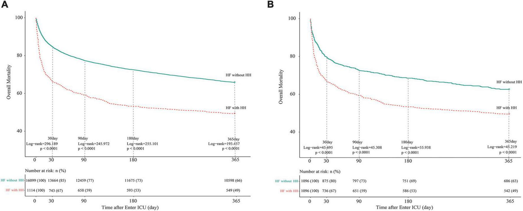 Kaplan-Meier survival curves of HF patients with and without HH. (A) Before PSM; (B) after PSM. The differences between the HF with- and without-HH groups were measured by the two-side log-rank test with a P-value < 0.05. HH, hypoxic hepatitis; HF, heart failure; PSM, propensity score matching.