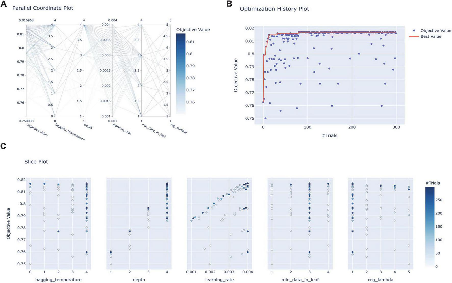 Hyperparameter optimization process for the Catboost model. (A) Parallel coordinate system plot of the hyperparametric distribution corresponding to different levels of AUC values, where darker colors correspond to greater AUC values; (B) optimization history plot illustrating the evolution of optimal values during hyperparameter optimization; (C) slice plot visualizing the correlation between each parameter and the AUC. CatBoost, categorical boosting.