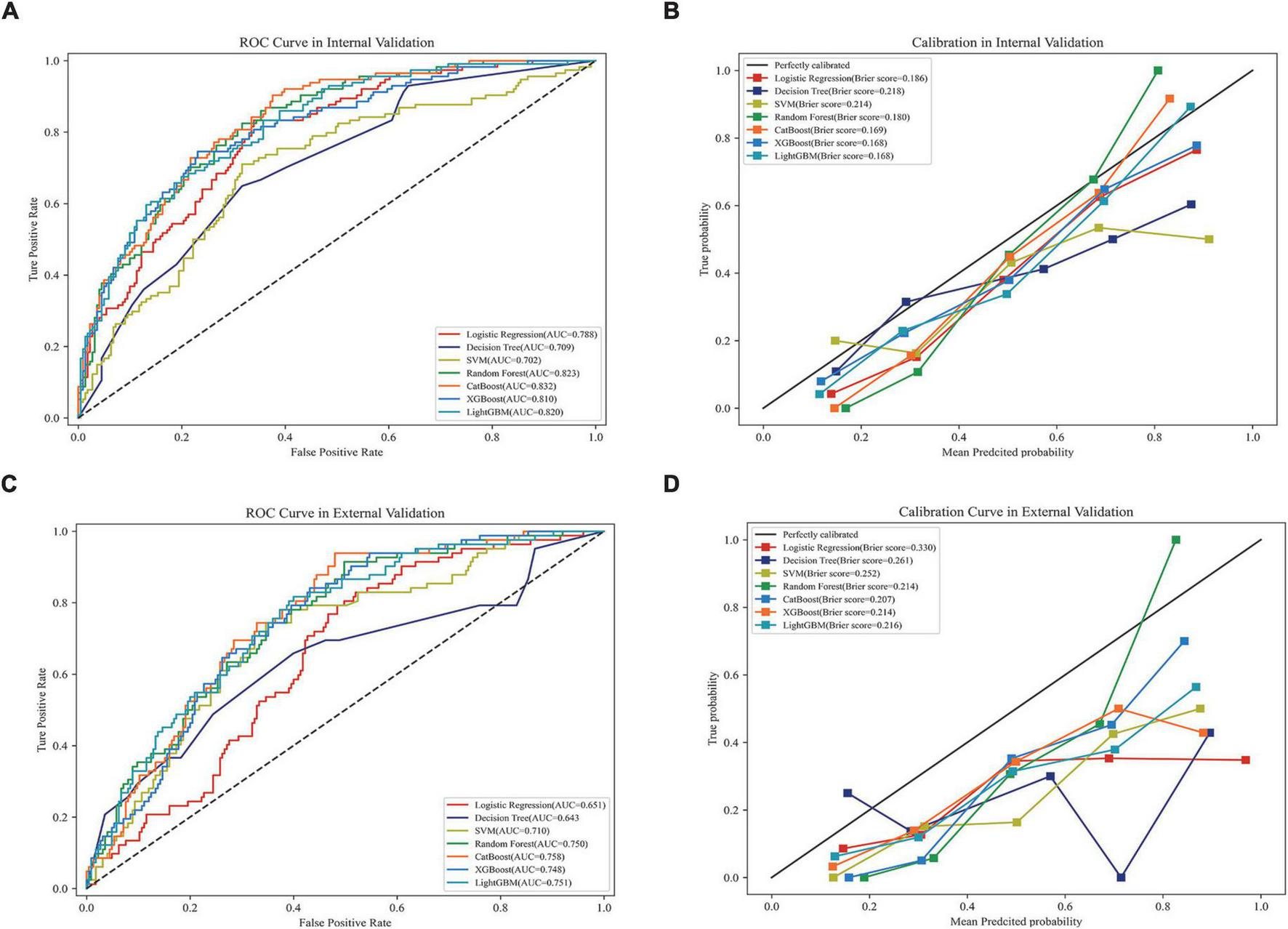 In internal validation, Catboost achieved the highest AUC score (AUC, 0.823; 95CI%, 0.819–0.845) (Figure 3A), while the calibration of the LightGBM and XGBoost models was the best (Brier score, 0.168; 95% CI, 0.162–0.174), followed by the calibration of the Catboost model (Brier score, 0.169; 95% CI, 0.162–0.174) (Figure 3B). As a result of external validation, the Catboost had the highest AUC among other models (AUC, 0.757; 95% CI, 0.739–0.776) (Figure 3C), and in terms of calibration, the Catboost outperformed other models as well (Brier Score, 0.207; 95%CI, 0.202–0.211) (Figure 3D). The overall performance of the seven models in internal and external validation can be found in Table 2, where the Catboost model outperformed others in terms of MCC score, F1 score, recall, and accuracy. The learning curve of each model in the training process with final parameters is provided in Supplementary Figure 6.