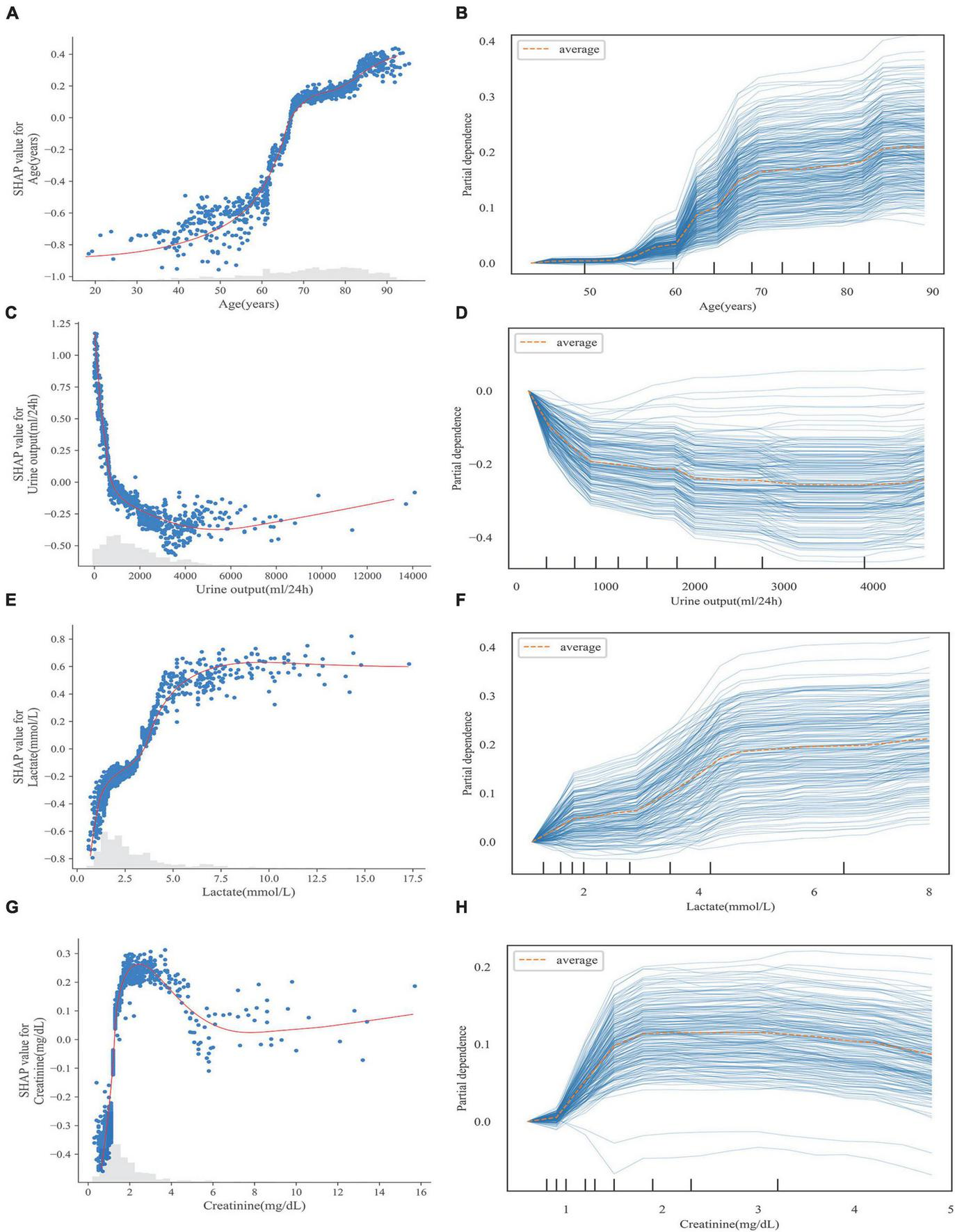 Figure 6 illustrates the relationship between the four continuous variables of higher importance and the final predicted outcome in the S-CatBoost model. The role of individual features on the final prediction outcome can be directly observed in scatter plots based on the SHAP values. To further clarify the impact of particular features on the final predicted outcome, we also introduced PDP and individual conditional expectations (ICE) plots, another strategy for exploring the relationship between eigenvalues and predicted results. By visualizing the feature dependency for each case, the ICE plot shows the changing trend of the predicted outcome as the feature changes, while DPD calculates the mean level of the feature across all samples. The risk of death rapidly increased with age between the ages of 50 and 70, a trend that was more pronounced for ages between 60 and 70 (Figure 6A), while the trend began at 55 in the PDP, and the trend for ages 60–70 was consistent with the scatter plots (Figure 6B). It can be seen from Figure 6C that when urine output is less than 1,000 ml, the risk of death increases rapidly with decreasing urine output, and a similar trend can be seen in PDP (Figure 6D). The changing relationship between lactate values and the predicted outcome was consistent in Figures 6E,F. It appears that, below 5 mmol/L, the risk of death increased sharply with increasing lactate, and this trend slowed down between 2 and 3 mmol/L, but hardly increased at all after exceeding 7.5 mmol/L. Additionally, creatinine showed a relatively consistent trend in the PDP and scatter plots. When creatinine did not exceed 2 mg/dl, the risk increased with increasing creatinine. However, the risk began to decrease after creatinine exceeded 2 mg/dl, although this trend was more pronounced in the scatter plots (Figures 6G,H). The scatter and PDP plots for other continuous variables are shown in Supplementary Figure 9.