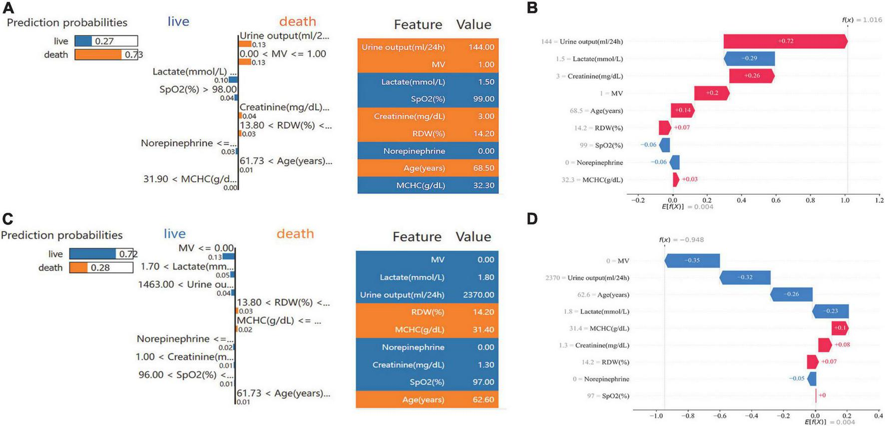 The importance of features in the full Catboost model was largely consistent according to the model’s importance and the SHAP values, with MV, age, urine output, and lactate ranking highest (Supplementary Figure 8). According to feature importance in the S-Catboost model, the top five most important features were: urine output, lactate, age, creatinine, and RDW (Figure 5A). According to SHAP values, the top five features were age, MV, lactate, urine output, and creatinine (Figure 5B). The SHAP summary plot also illustrates features’ positive and negative effects on prediction results. The increase in age, MV, high lactic acid, and low urine output were associated with an increased risk of death, but the effects of creatinine and RDW on death risk do not follow a linear pattern (Figure 5B).