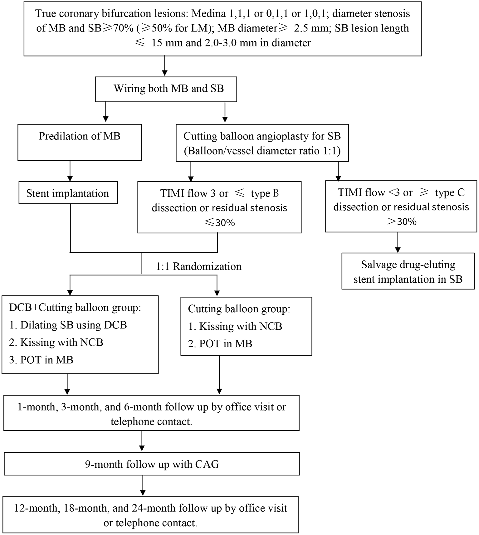 Flowchart of the clinical trial design. MB, main branch; SB, side branch; LM, left main; TIMI, thrombolysis and thrombin inhibition in myocardial infarction; DCB, drug-coated balloon; NCB, non-compliant balloon; POT, proximal optimization technique; CAG, coronary angiography.