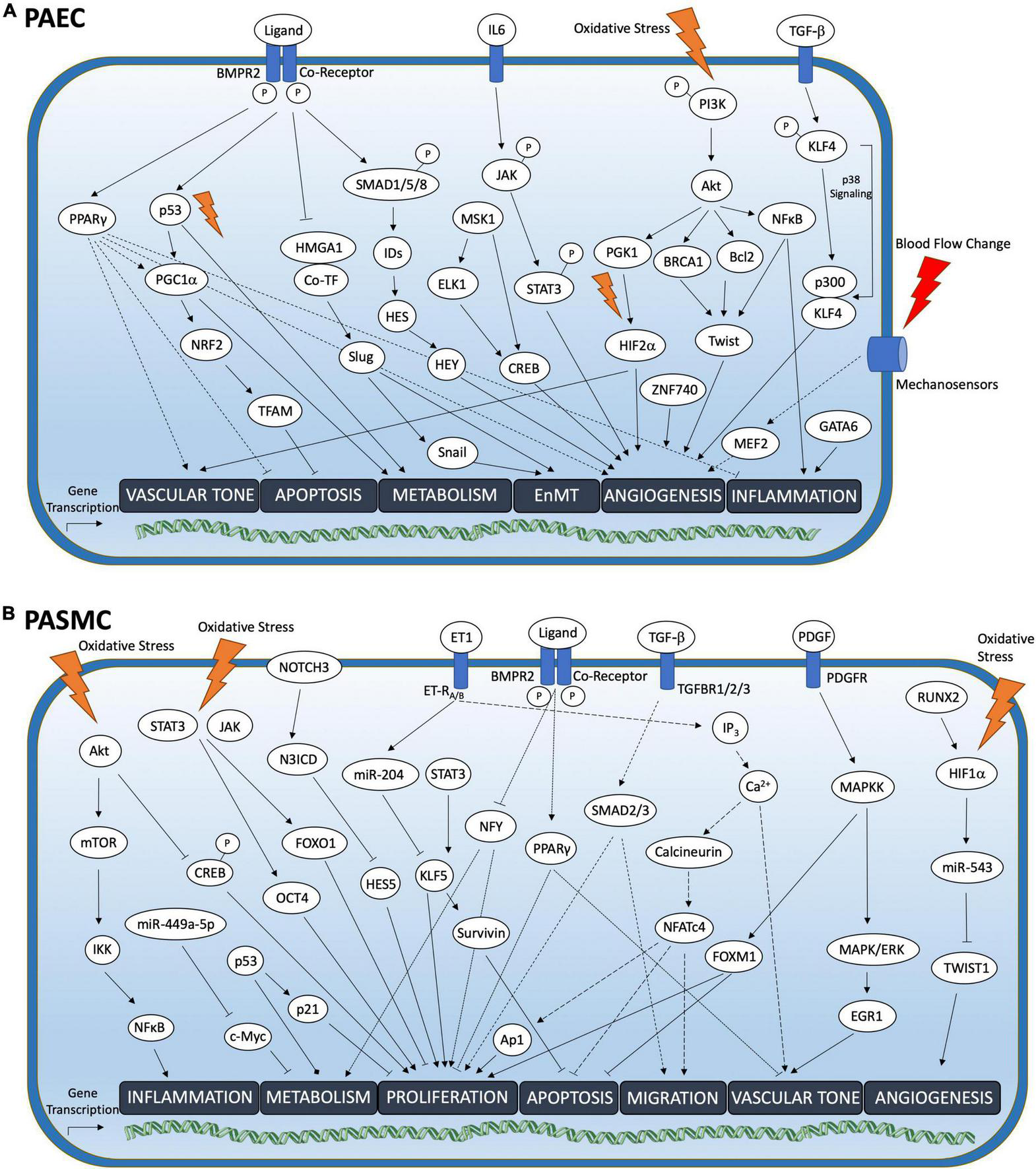Figure 1. Transcription factor pathways in PAEC and PASMC associated with PAH. Overview of pathogenetically relevant transcription factor (TF) pathways in (A) pulmonary arterial endothelial cells (PAEC) and (B) pulmonary arterial smooth muscle cells (PASMC) upon activation by cell membrane anchored receptor signaling or cellular stress events. Depending on the pulmonary vascular cell type TF activation mediated gene transcription elicits cell-type specific downstream responses. Blue box represents cell membrane. Ca2+, Calcium; IP3, Inositol 1,4,5-trisphosphate; ET-RA/B, Endothelin Receptor Type A and B; TGFBR1/2/3, TGF-ß receptor 1/2/3; −p, Phosphorylation.