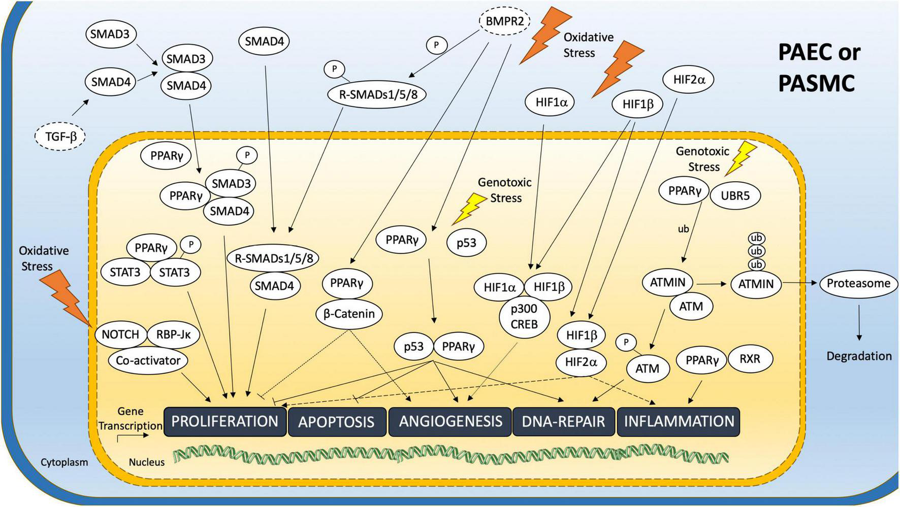 Cyclic adenosine monophosphate (cAMP) response element binding protein (CREB) functions as an anti-proliferative TF in healthy PASMC. In PAH and associated oxidative stress with excessive production of reactive oxygen species (ROS) like H2O2, CREB is downregulated leading to enhanced proliferation of PASMC (49).