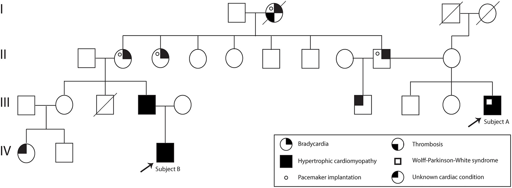 Subject A and B pedigree. Subject A and Subject B are indicated with an arrow. The family history of cardiac problems is depicted in the pedigree.