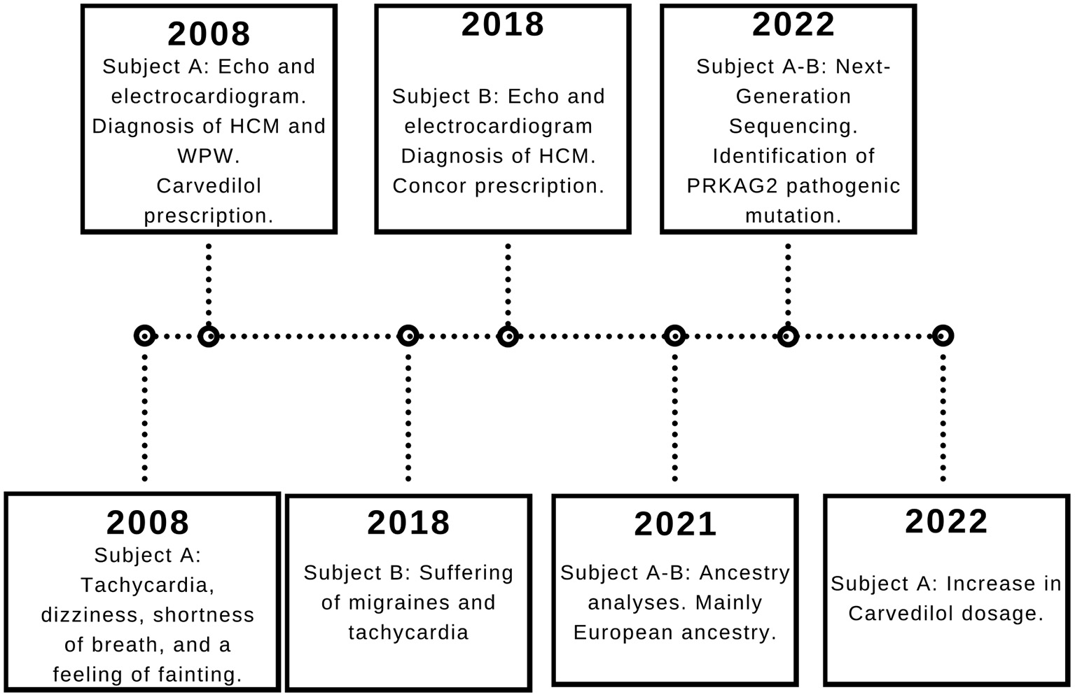 Moreover, 3 years ago, his cousin's son, an 18-year-old Ecuadorian male (Subject B) with the same familiar history of cardiac conditions (Figure 1), was referred to the cardiologist after suffering from migraines and tachycardia at any time of the day, especially after a sudden movement. Subject B underwent an electrocardiogram, and the results showed a systolic overload compatible with hypertrophic myocardiopathy, no association with WPW was found. Bisoprolol was prescribed at a dose of 1.25 mg daily, and the subject reported a significant reduction in the frequency of migraines. Similar to Subject A, a genomic screening was done. The timeline regarding subject A and B is presented in Figure 2.