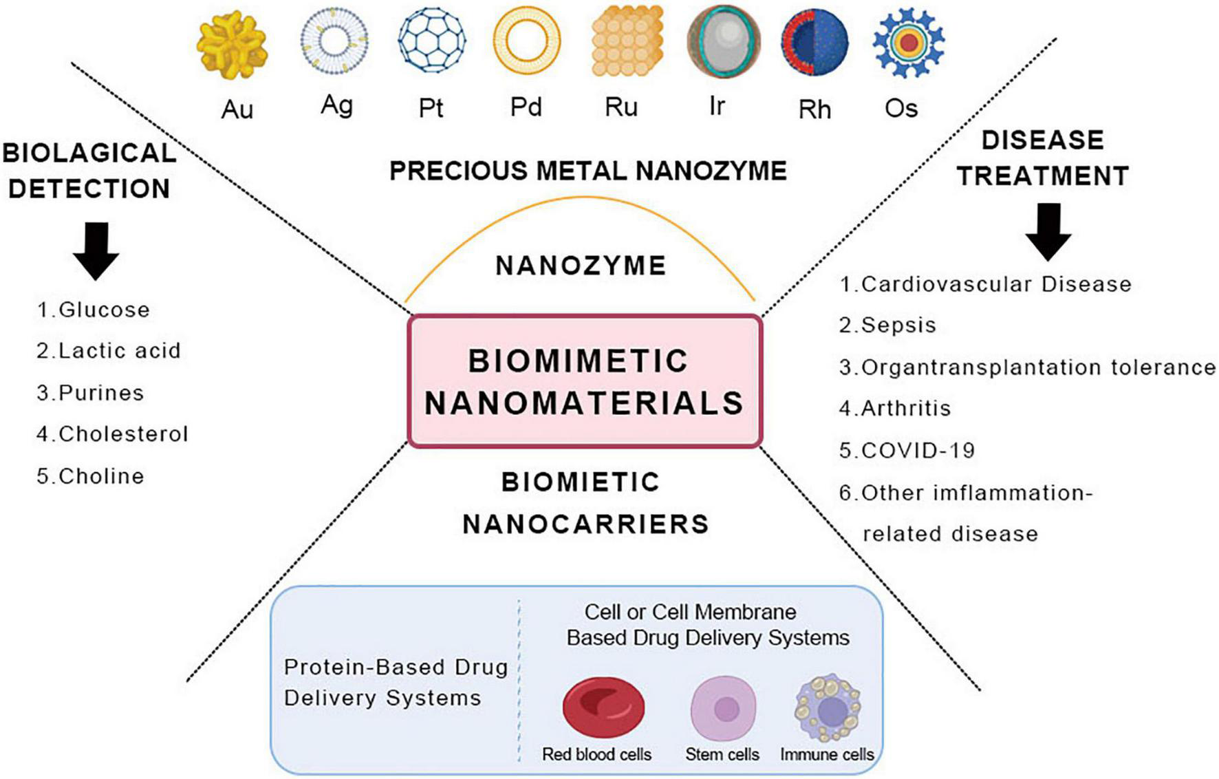 Biomimetic materials and nanomaterials are the two components that make up biomimetic nanomaterials. Biomimetic nanoparticles with specific biological features are synthesized by carefully combining nanoparticles with biomimetic materials (such as cell membranes, lipoproteins, viruses, etc.). This way, the original nanoparticles’ toxicity and immunogenicity are successfully decreased. However, the nanoparticles should also have better histocompatibility and biological targeting, thus allowing for improved disease detection and treatment (5–7).