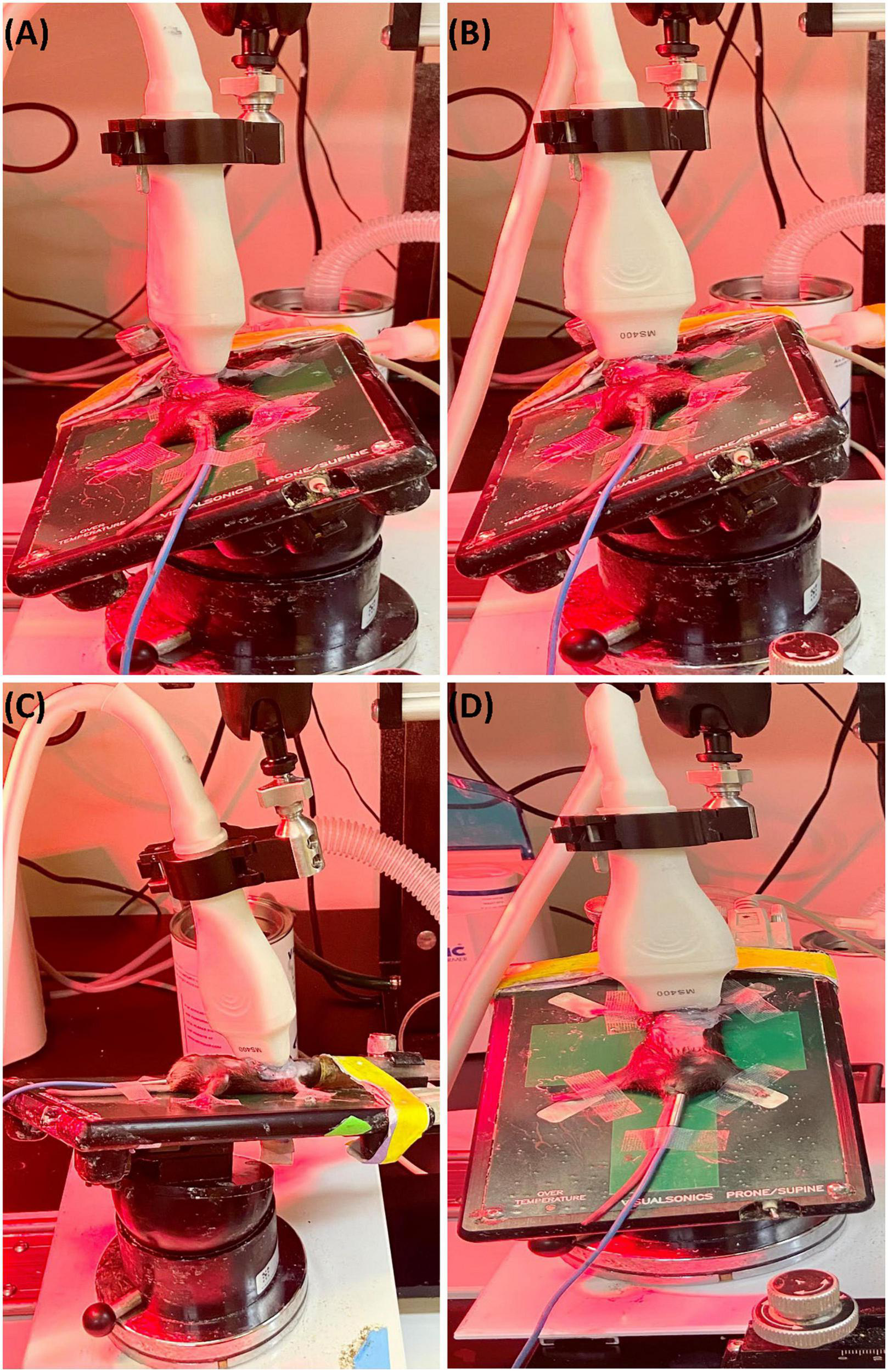 (A) Representative image showing probe positioning to obtain parasternal long axis (PLAX) views. (B) Parasternal short axis (PSAX) views are derived from the PLAX view by rotating the transducer probe in the rail system to approximately 90° clockwise. (C) To obtain apical views, the transducer probe is placed diagonally toward the head. (D) Views of the aorta can be acquired by shifting the transducer probe from the PSAX view cranially to the level of the aortic valve.