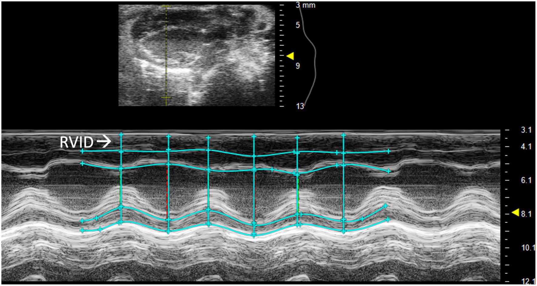 Right ventricular internal diameter (RVID) provides metric dimensions of the right ventricle during systole and diastole. To obtain this parameter, a PSAX or PLAX M-mode image should be captured with the M-mode line positioned over the RV. Obtaining the correct view may require repositioning the platform 45° to the right. Furthermore, skin reverberation artifacts can easily be confused with the RV, therefore flow on Doppler or movement in a B-mode image should be used to confirm that the RV is correctly identified. In PSAX or PLAX M-mode, RVID;s and RVID;d should be selected [instead of the intraventricular septum (IVS) IVS;s and IVS;d] to measure the diameter of the right ventricle (Figure 2). This parameter will also measure IVS, left ventricular internal diameter (LVID), and left ventricular pulmonary wall (LVPW). Increased RVID would be indicative of right ventricular dilation or volume overload and thus useful to evaluate RHF.