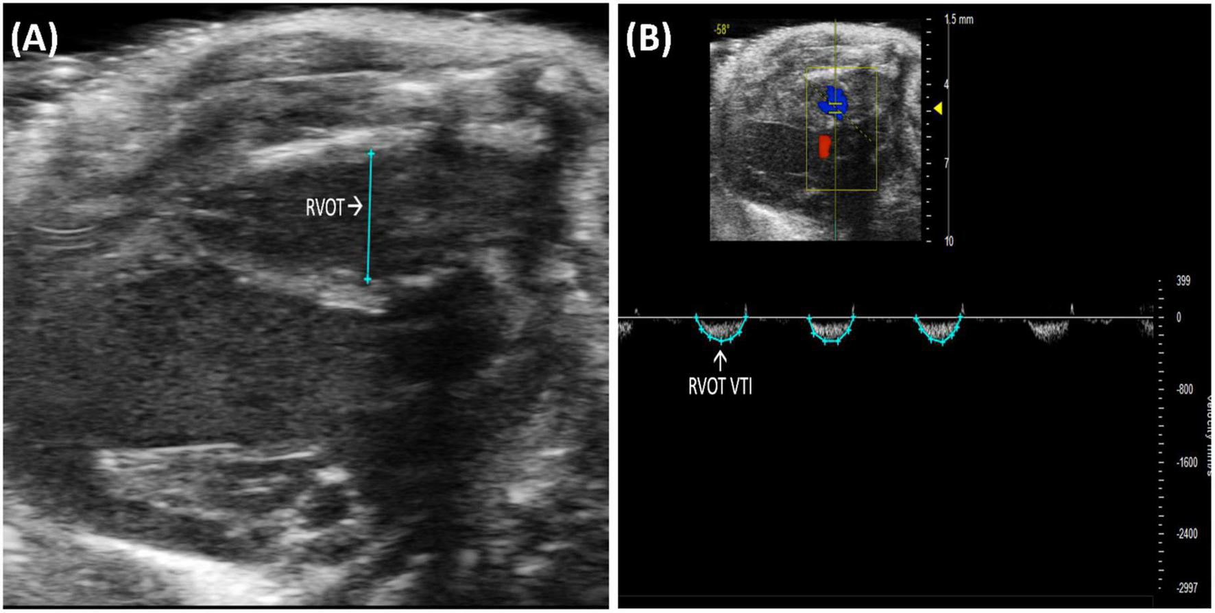 (A) Right ventricular outflow tract (RVOT) measures the size of the right ventricular outflow tract at the end of diastole and is acquired and analyzed in B-mode of the parasternal long axis (PLAX) view. (B) Right ventricular outflow tract velocity time integral (RVOT VTI) measures blood flow through the right ventricular outflow tract (RVOT) and is acquired by pulsed wave (PW) Doppler imaging of the RVOT in B-mode of the parasternal long axis (PLAX) view.