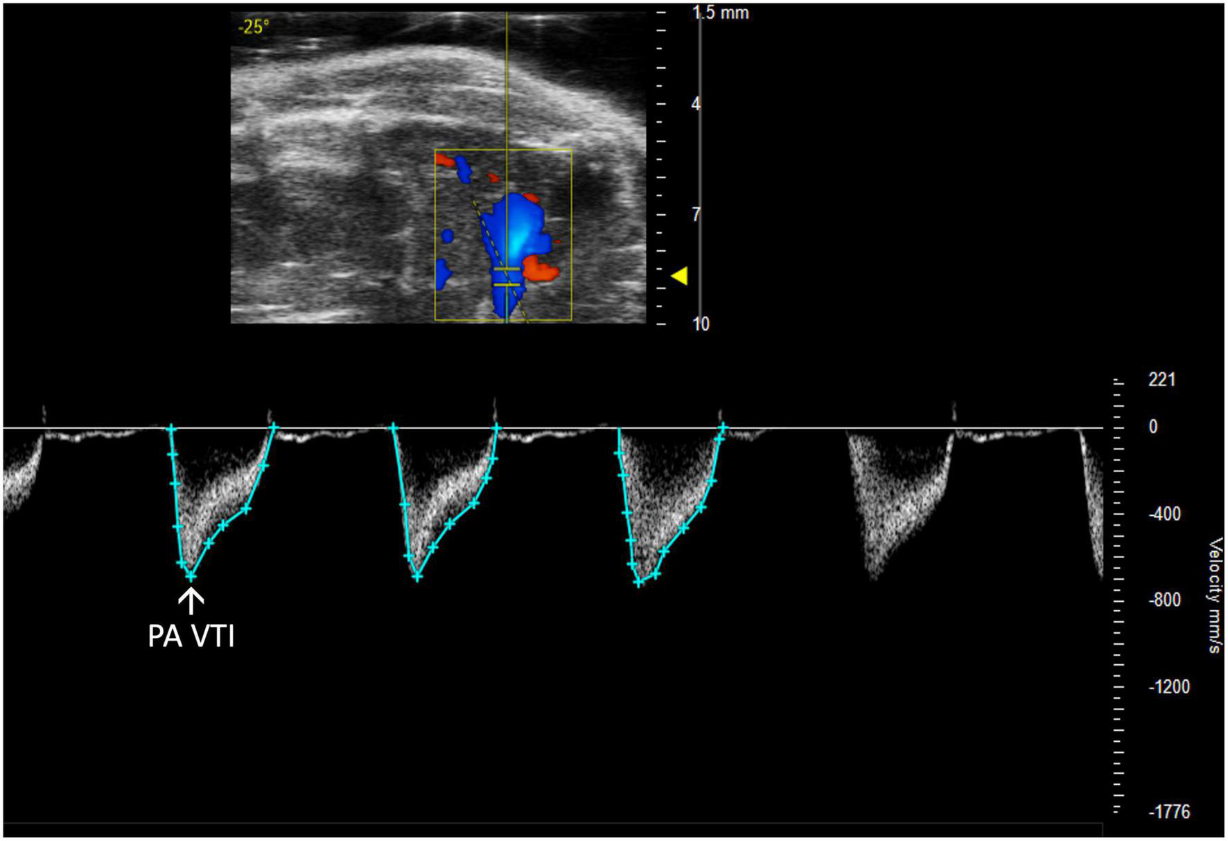 Pulmonary artery velocity time integral (PA VTI) directly measures blood flow through the pulmonary artery and is acquired as the area under the curve in pulsed wave (PW) Doppler mode of the parasternal long axis (PLAX) view.