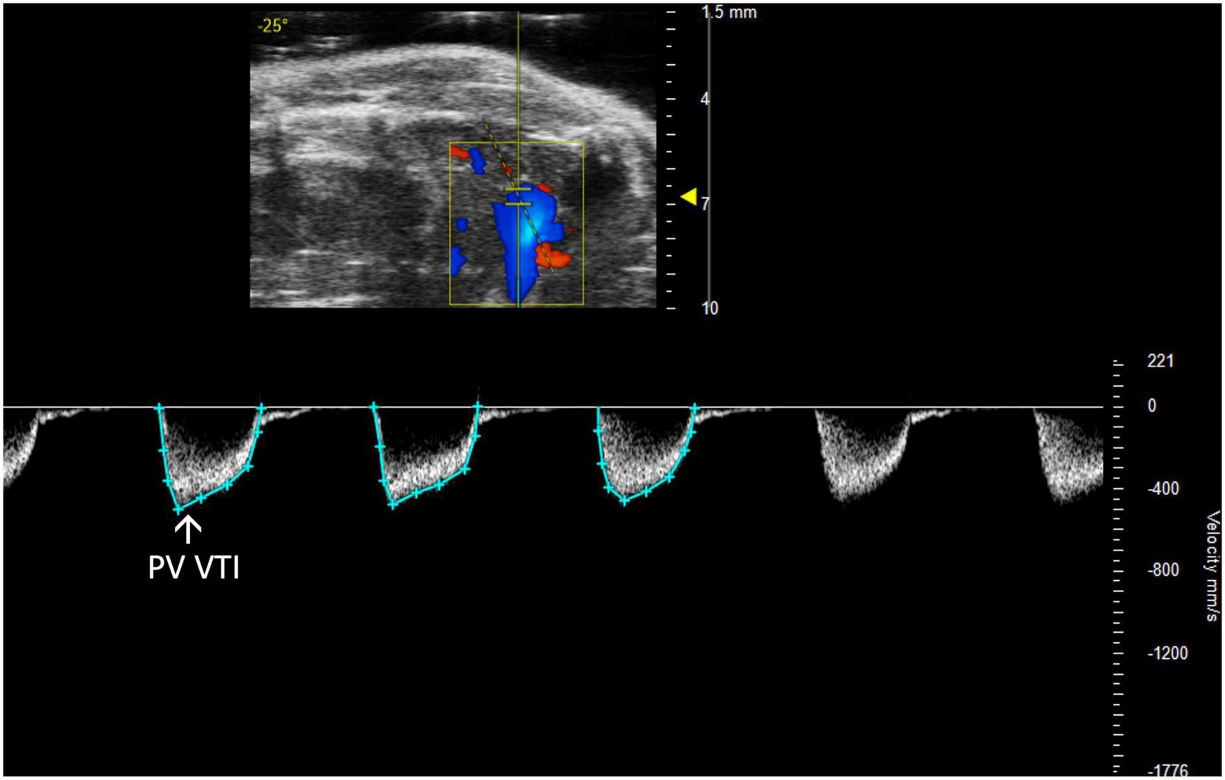 The pulmonary valve velocity time integral (PV VTI), a measure of blood flow through the pulmonary valve, is calculated by measuring the area under the curve in pulsed wave (PW) Doppler mode of the parasternal long axis view (PLAX).