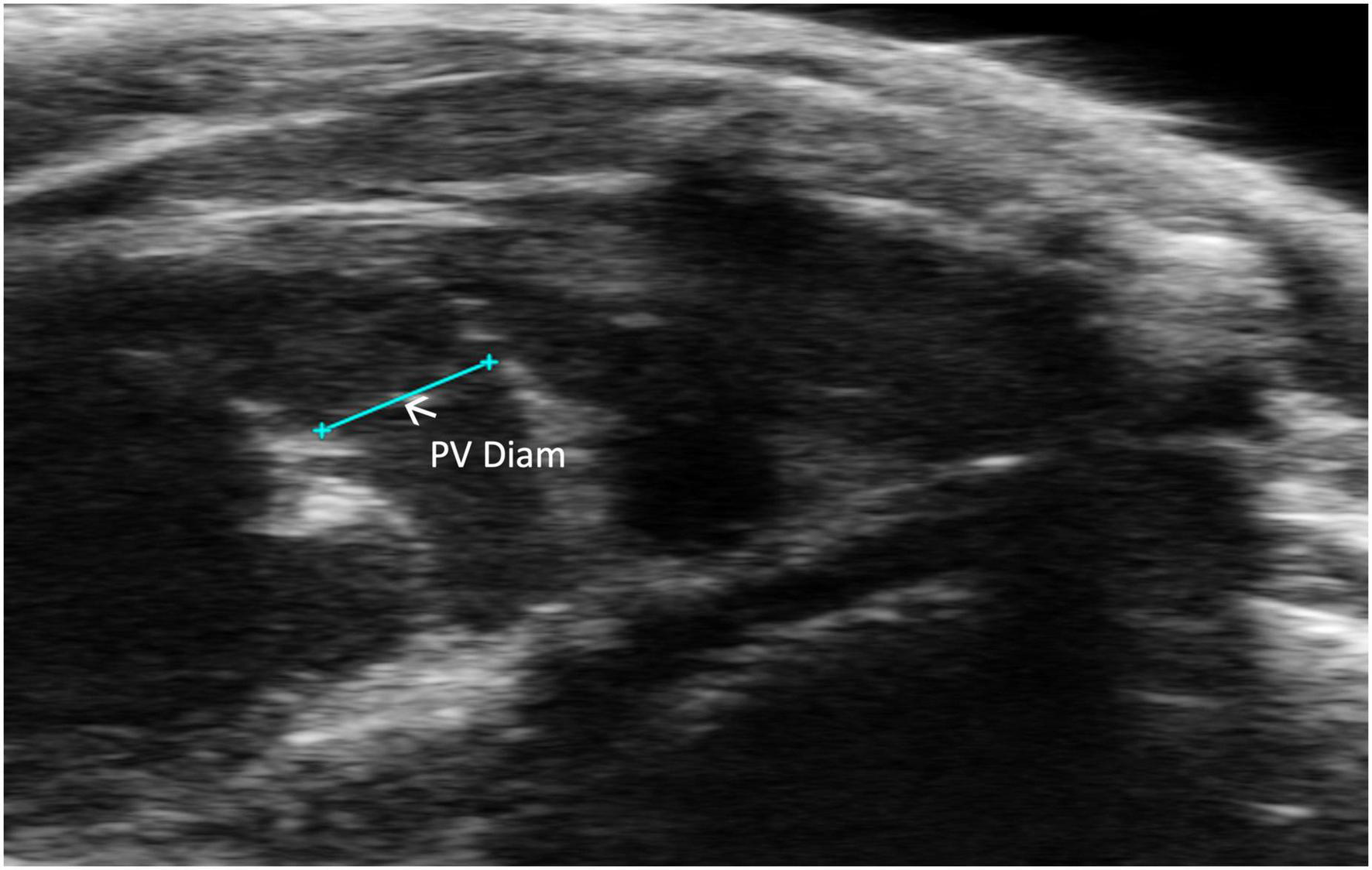 Pulmonic valve (PV) diameter is acquired and analyzed in B-mode of the parasternal long axis (PLAX) view.