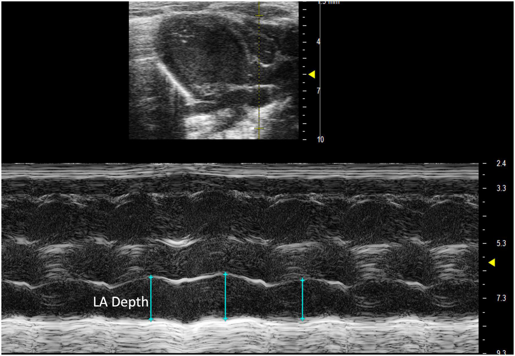Left atrial depth can be measured vertically at end diastole. To perform this parameter, a PLAX M-mode image should be captured with the yellow line positioned over the LA, which is located inferior to the aorta (Figure 8).