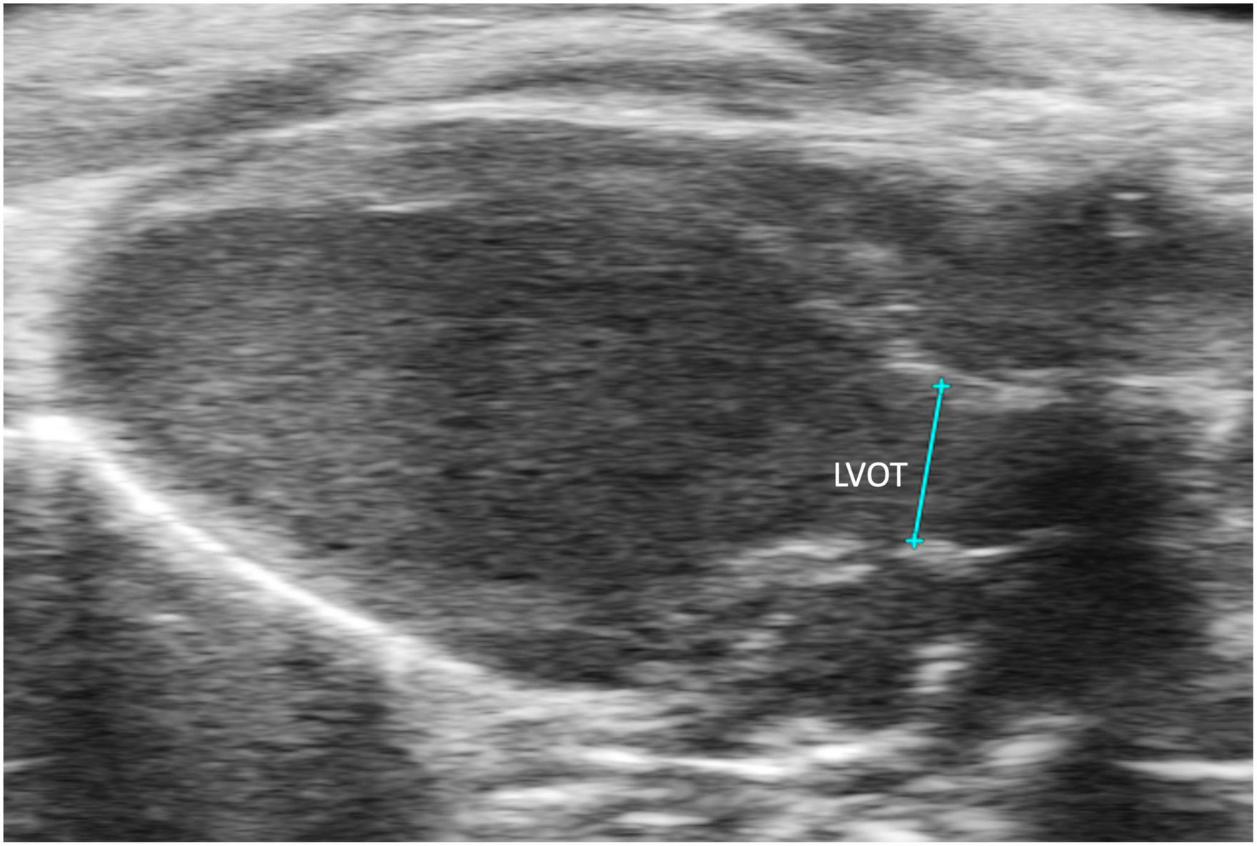 The left ventricular outflow tract (LVOT) length is acquired in the B-mode of the parasternal long axis view (PLAX).