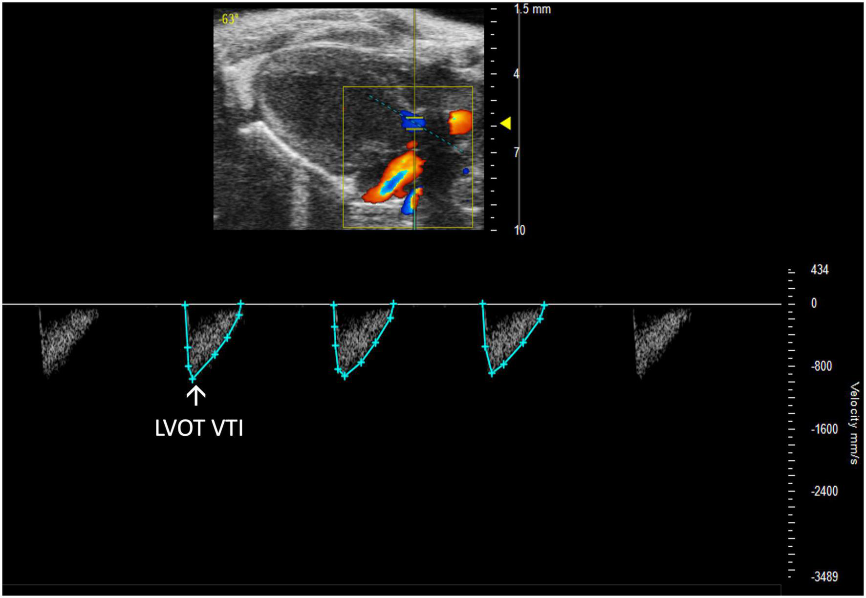 Left ventricular outflow tract velocity time integral (LVOT VTI) is defined as a measurement of blood flow out of the ascending aorta. It can be measured as the area under the curve in a PLAX PW Doppler mode image with the cursor over the flow of the ascending aorta (Figure 10). LVOT VTI has been shown to be representative of CO in humans and more predictive than EF or Doppler derived CO in patients with heart failure (10). Thus, we hypothesize that LVOT VTI is an accurate measure of systolic function and CO in mice as well, but this remains an interesting area of study for future directions. LVOT and LVOT VTI can be used to calculate SV, CO, and AVA:
