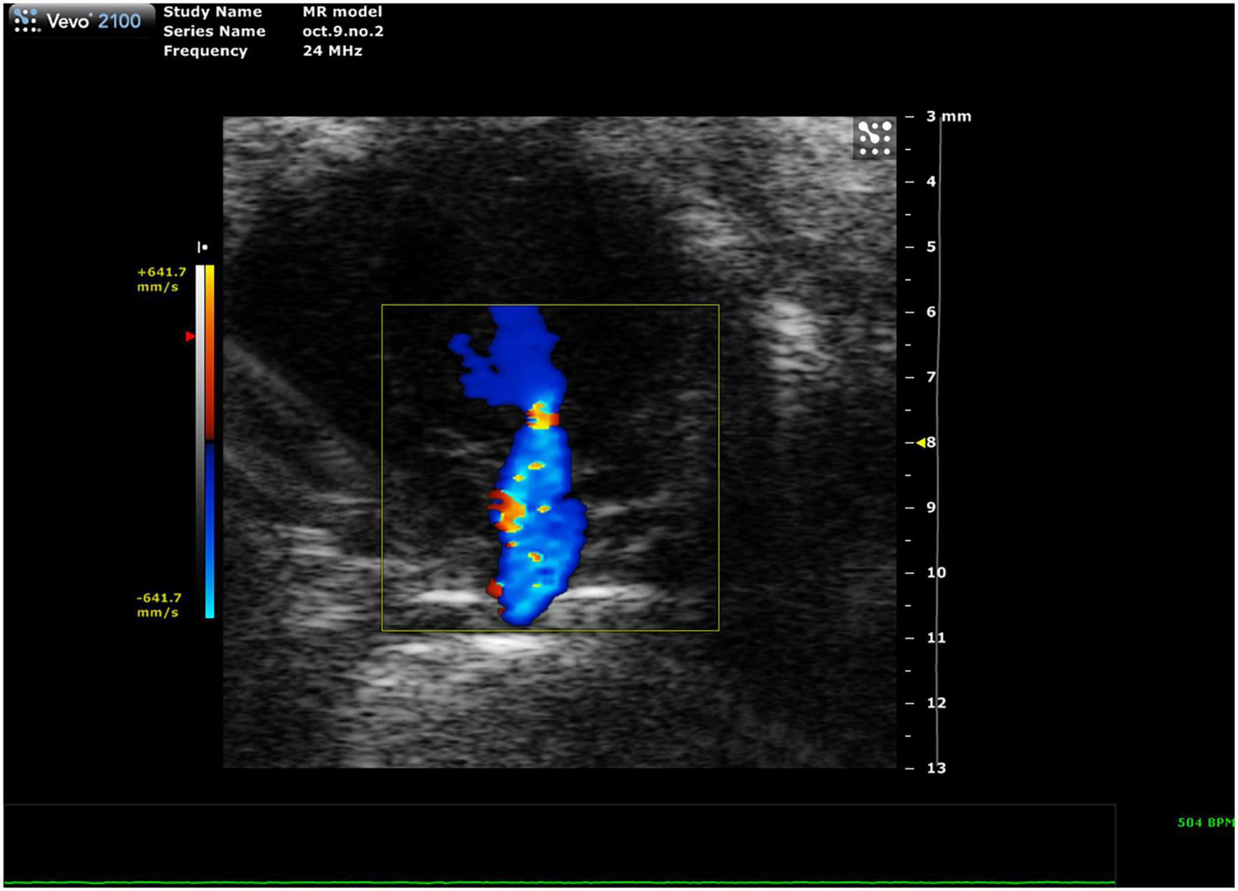 Mitral regurgitation (MR) has not been well-described in mice because of their resistance to developing mitral valve prolapse (11). However, Li et al. recently reported the first mouse model of severe MR (Figure 11, 12). To continue development of mouse models of MR, it is important to be able to recognize the presence of mitral regurgitation, which appears as a mixed color pattern of systolic backflow from the LV to the LA on PSAX Color Doppler.