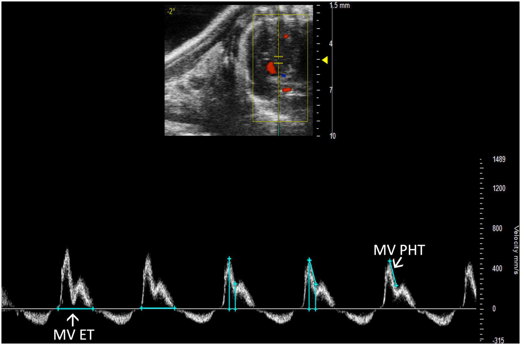 Pulsed wave (PW) Doppler mode image showing mitral valve pressure half time (MV PHT), a measure of mitral stenosis and mitral valve ejection time (MV ET), the duration of diastolic filling in the left ventricle.