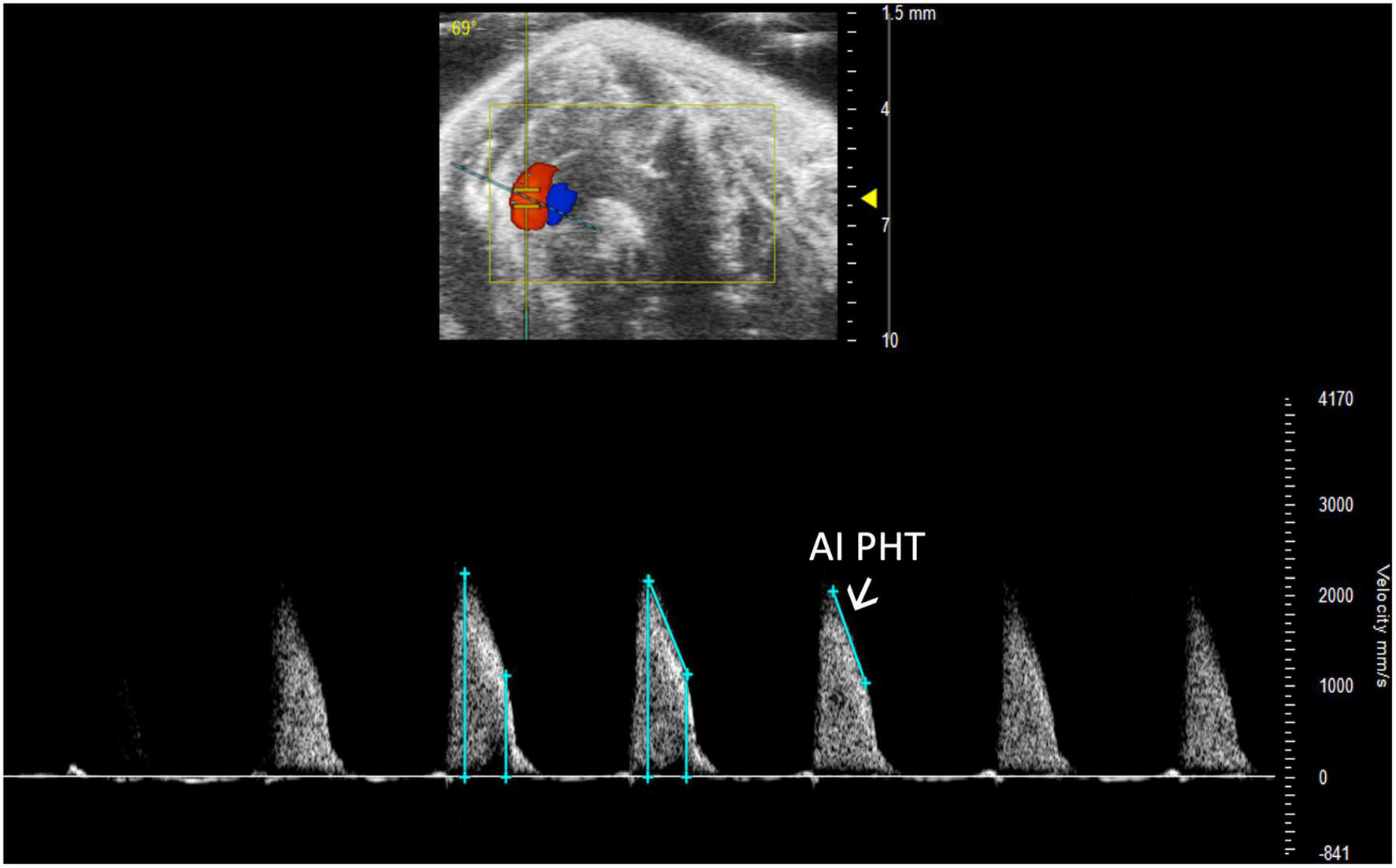 Aortic insufficiency pressure half time (AI PHT) represents the degree of regurgitation and reflects the left ventricular end diastolic pressure and is measured in pulsed wave (PW) Doppler mode of the aortic valve.