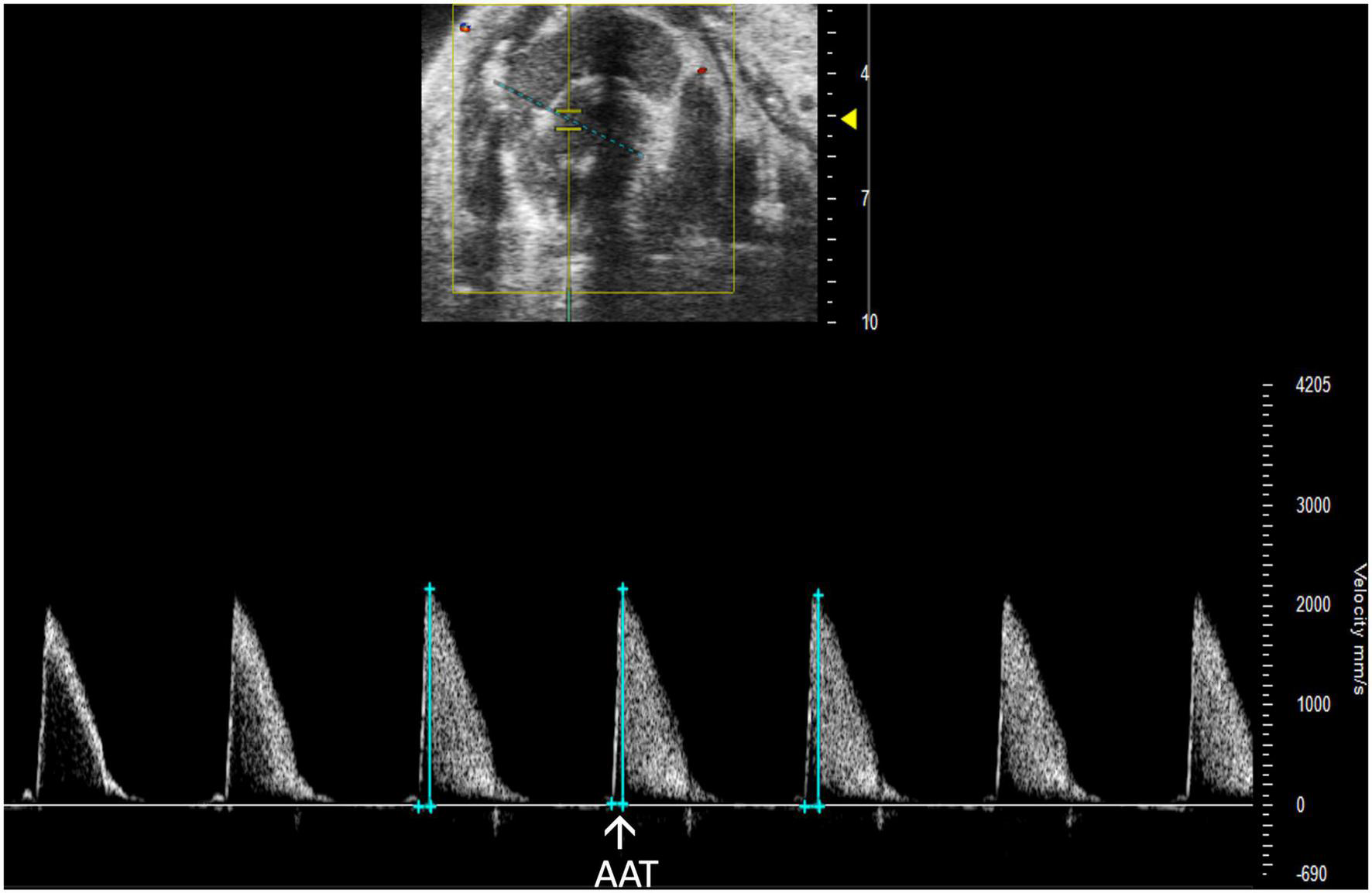 Pulsed wave (PW) Doppler mode image showing analysis of the aortic acceleration time (AAT), a measurement of left ventricular contractility in mice.