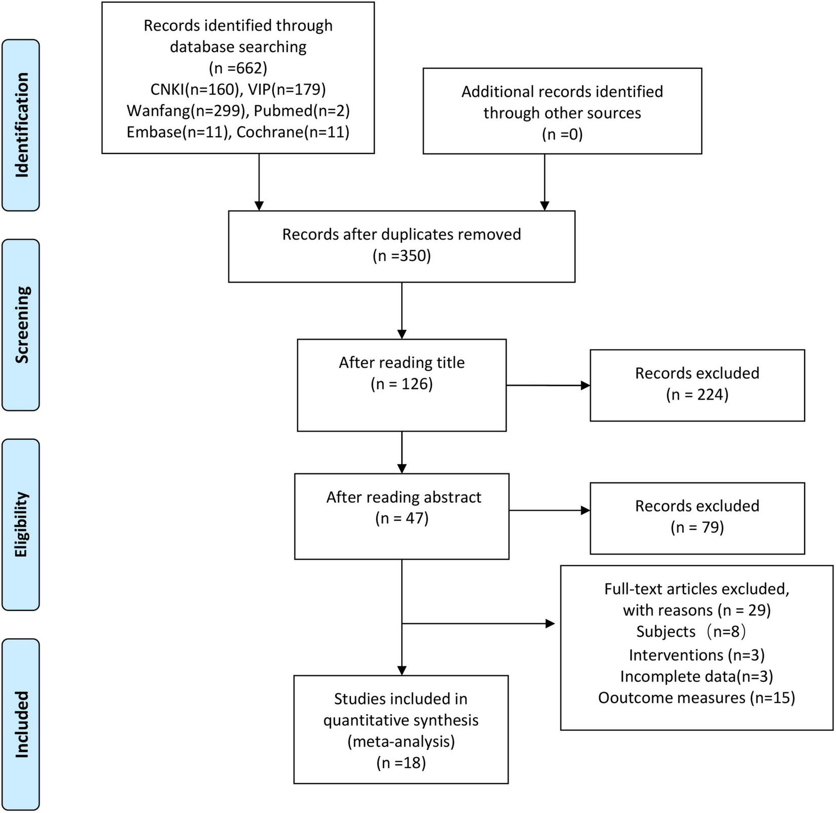 A total of 662 studies were retrieved. After the elimination of duplications by NoteExpress and manual assistance, 350 studies remained. After reading the abstracts and titles, 47 studies remained. After reading the full text, 18 studies were finally included (29–46). The screening flow chart was shown in Figure 1.
