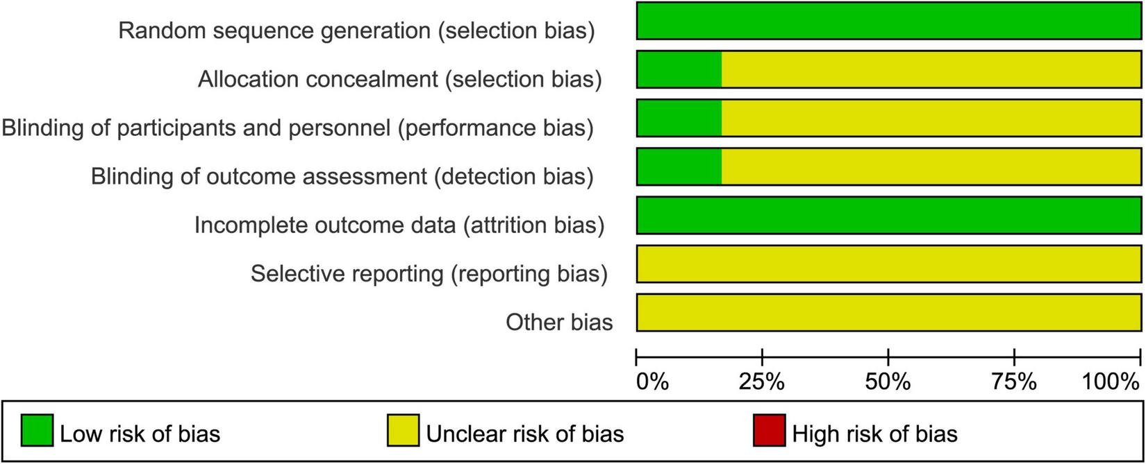 Two researchers (ML and QZ) assessed the risk bias of the included studies by the Cochrane Risk of Bias Assessment Tool (19), which included 7 items (1) random sequence generation; (2) whether allocation concealment was implemented; (3) whether the investigators and subjects were blinded; (4) whether the outcome evaluators were blinded; (5) whether the outcome data were complete; (6) whether there was selective outcome reporting; (7) whether there were other sources of bias. The evaluation was based on 3 evaluation criteria: low risk, high risk, and unclear risk. Any disagreements regarding the risk of bias and quality assessment will be discussed and resolved with the third researcher (XZ).