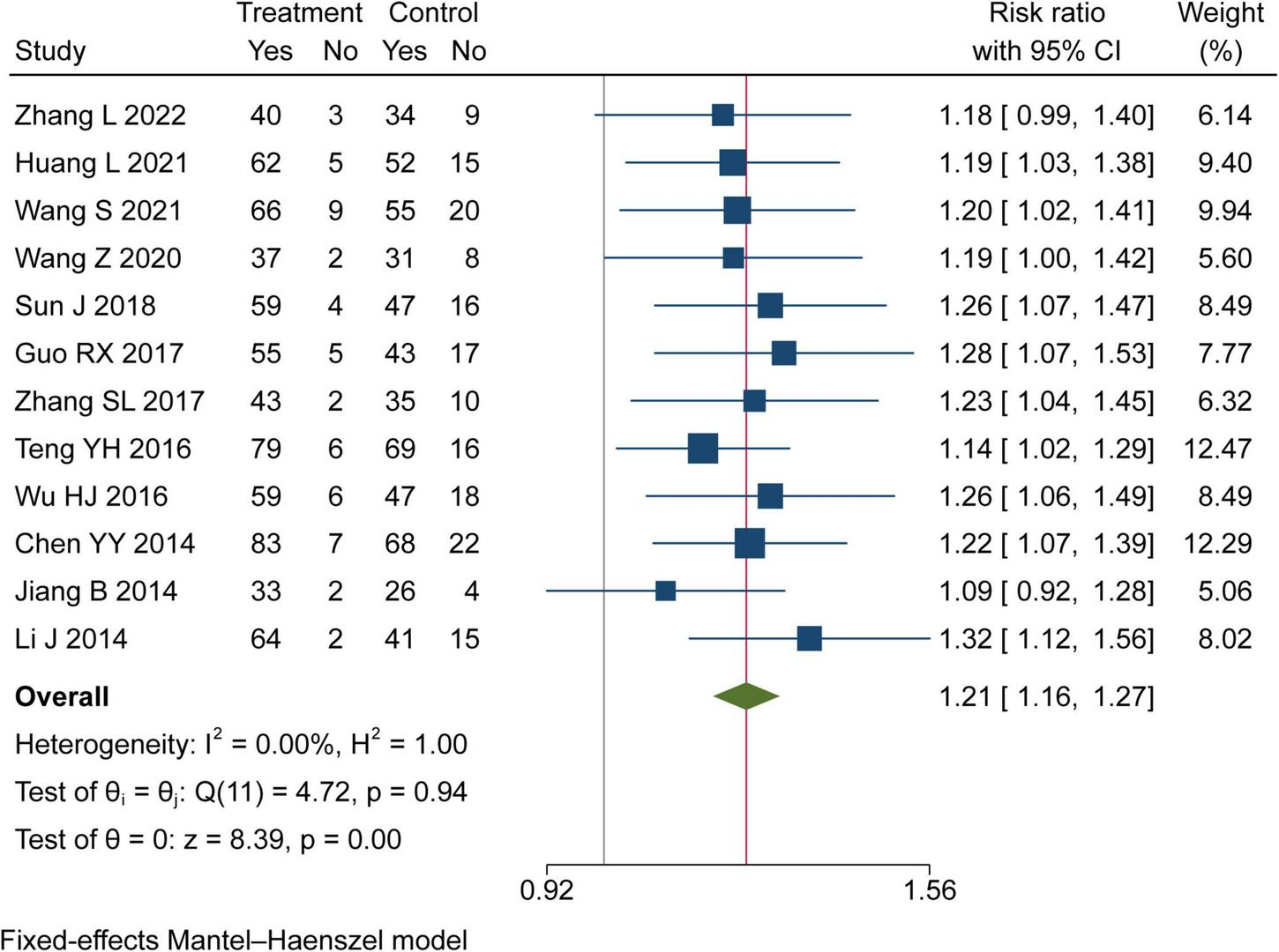 | Clinical efficacy rate | 12 | 1,451 | 1.21 | (1.16, 1.27) | 8.39 | 0.00 | 0.00 | 0.94 |