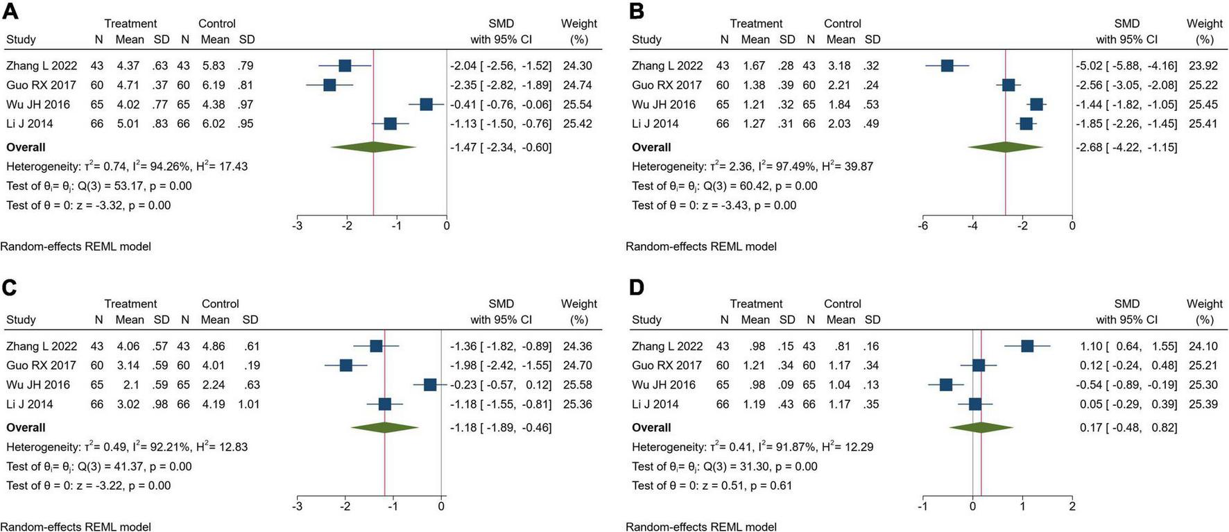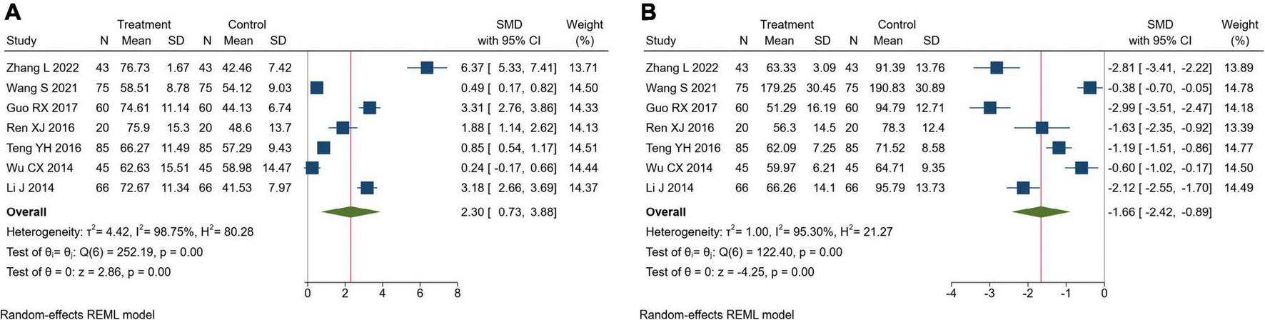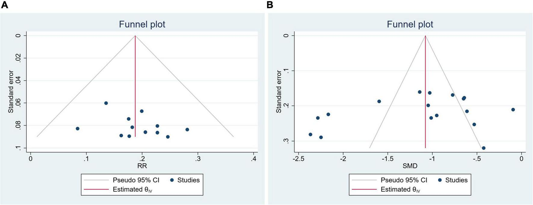 The Stata 17.0 software (Stata Corp., College Station, TX, USA) was applied to perform the meta-analysis. Standardized mean difference (SMD) was utilized for continuous outcomes. Risk ratio (RR) was utilized for dichotomous outcomes. All of them were expressed with a 95% confidence interval (CI). Heterogeneity was tested using the Q test. If I2 ≤ 50%, the fixed-effects model was selected, and if I2 > 50%, the random-effects model was selected. The publication bias was estimated by Egger’s test and funnel plot. Results were considered statistically significant when p < 0.05.