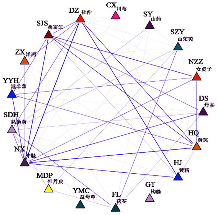 Association analysis was performed using IBM SPSS Modeler 18.0 software. The core herb pairs and herb groups were identified using the Apriori algorithm. The parameters were set to support ≥ 20%, confidence ≥ 90%, and the maximum number of antecedents was 2. Subsequently, core herbs were selected for network pharmacology analysis.