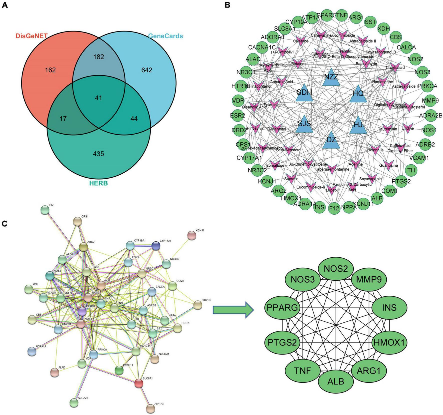 BATMAN-TCM2 (21) was used to collect the active components and targets of core herbs. The parameters were set as score>30 and P< 0.05. GeneCards3 (22) and DisGeNET4 (23) were used to collect the targets of hypertension. GeneCards parameters were set as relevance score ≥ 4. DisGeNET parameters were set as gene-disease association score ≥ 0.2.