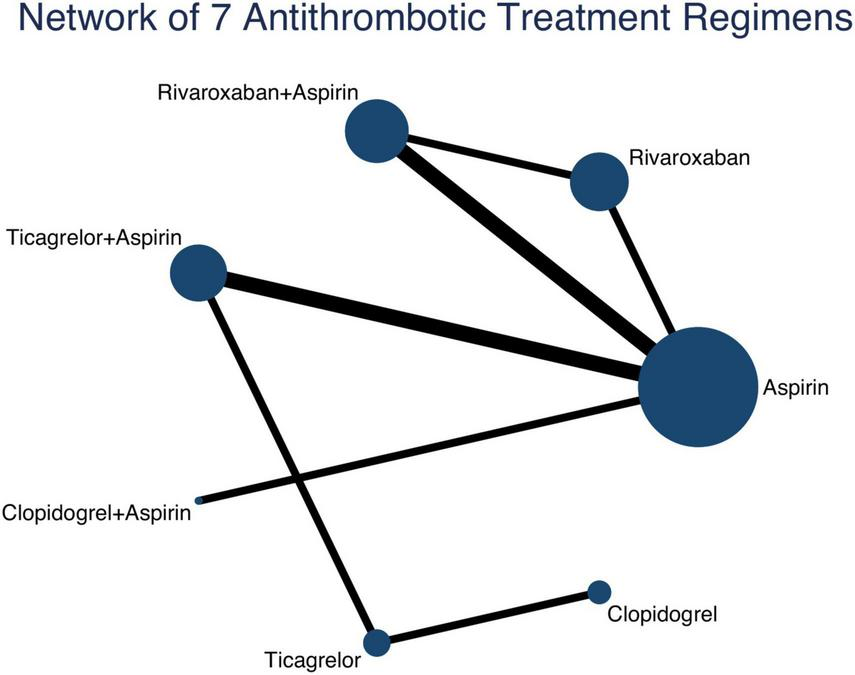 Network of 7 antithrombotic treatment regimens. Lines connect the interventions that have been studied in head-to-head (direct) comparisons in the eligible RCTs. The width of the lines represents the cumulative number of RCTs for each pairwise comparison and the size of every node is proportional to the number of randomized participants (sample size). RCTs, randomized controlled trials.